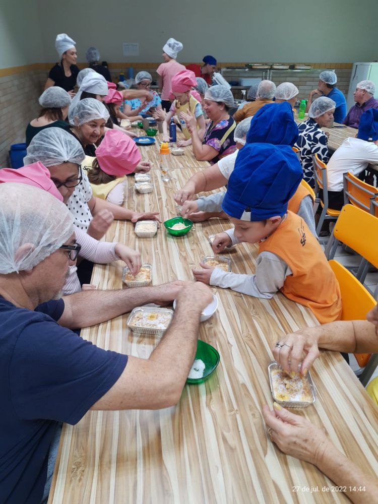 Os convidados ajudaram as crianças com os ingredientes da massa, o preparo e rechearam conforme sua preferência. Enquanto assavam, aproveitaram o momento para fazer uma atividade com o Grupo da Memória.