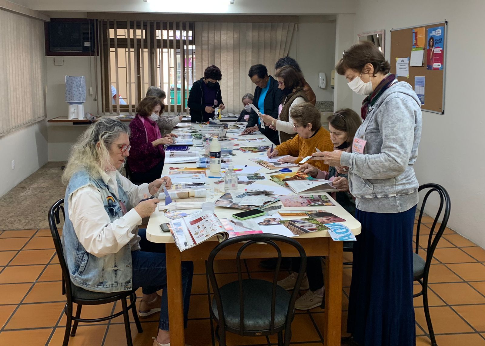 Utilizando imagens inspiradoras em diversos materiais como revistas e catálogos, os participantes recortaram as ilustrações, que chamavam a sua atenção e realizaram a colagem sob a mediação da instrutora do Trabalho Social com Grupos, Mônica de Gasper Alarcon.