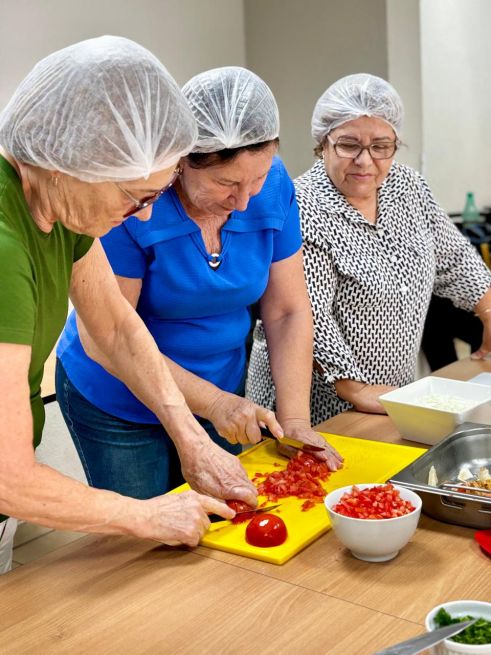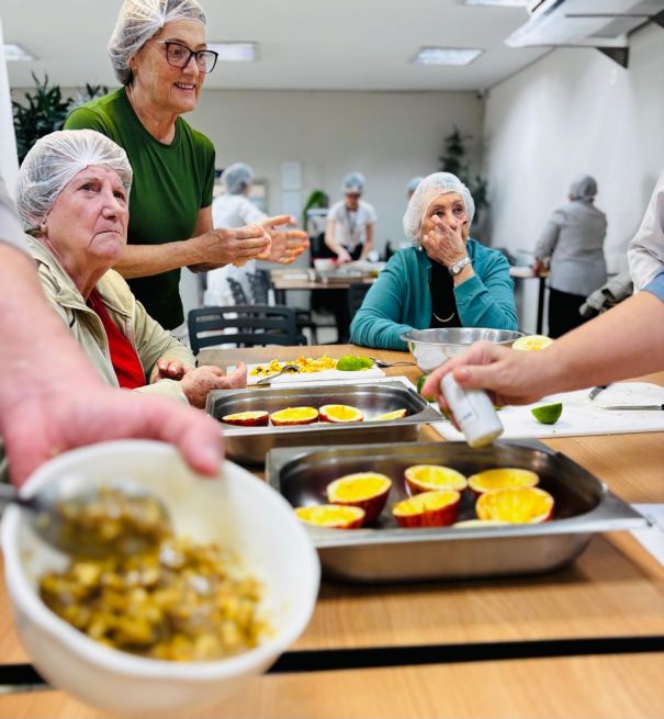 Na atividade, o conhecimento técnico das nutricionistas se somou às experiências de vida dos participantes 60+. O encontro foi marcado por entusiasmo: antes mesmo do início oficial, muitos já se reuniam em volta da bancada, ansiosos para colocar a mão na massa e iniciar o preparo das receitas.