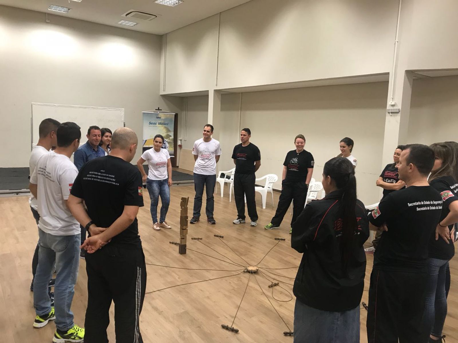 No dia 30/08, 20 Policiais Militares do Programa Educacional de Resistência às Drogas (Proerd) da Grande Florianópolis receberam capacitação de jogos cooperativos e trabalho em equipe, ministrada pelos profissionais da Unidade Sesc Móvel, no Sesc Palhoça. A ação, com duração de quatro horas, contou com um cronograma diversificado, onde os participantes aprenderam como construir um brinquedo com material alternativo e reciclável, conheceram o acervo cognitivo do Sesc Móvel e realizaram atividades em grupo, como jogos recreativos e dinâmicas.