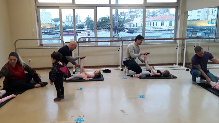 Os papais acompanharam e auxiliaram as pequenas bailarinas durante os exercícios de aquecimento e, em seguida, elas roubaram a cena, ensinando os passos de ballet e colocando os convidados para dançar ao lado delas.