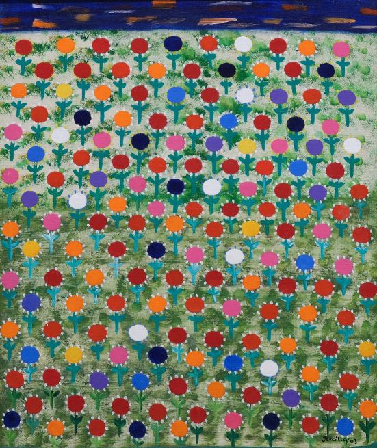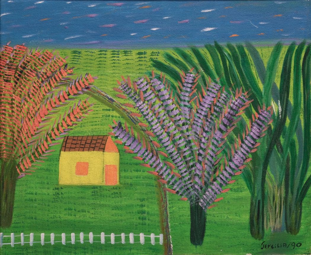 Desde então, inspirada por suas memórias de infância, a artista constrói um rico universo vibrante, repleto de cores que evocam cenários com arvoredos, flores, casas, animais e crianças. Natural de Piratuba, município do Oeste catarinense, sua produção encontra na paisagem local e nos temas regionais os elementos essenciais para suas criações, que refletem essa conexão com o espiritual e o invisível, suas percepções sensoriais e memória. Todo o repertório construído pela artista é observado nos quadros de pincelada marcante que recorre à técnica de acrílica sobre tela.