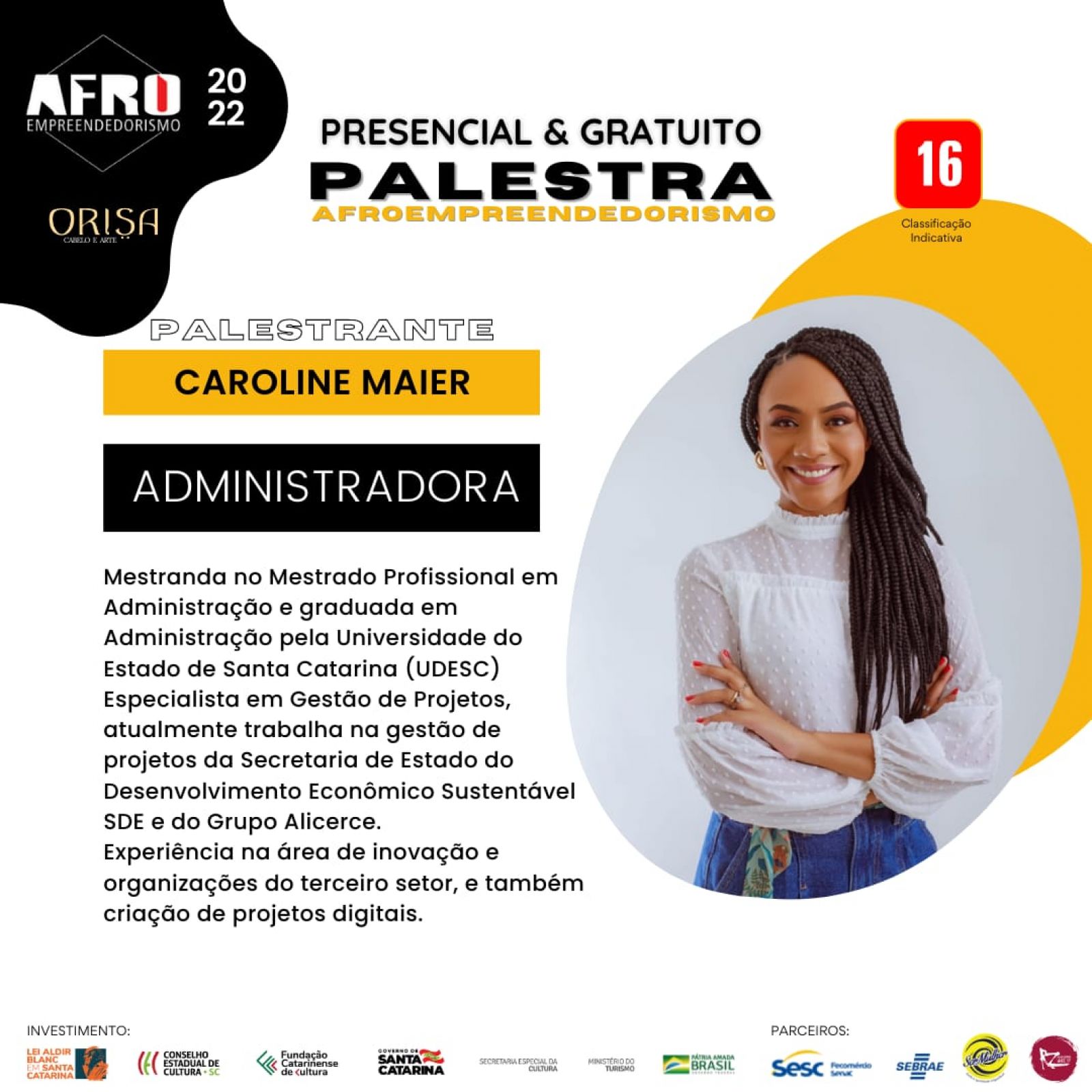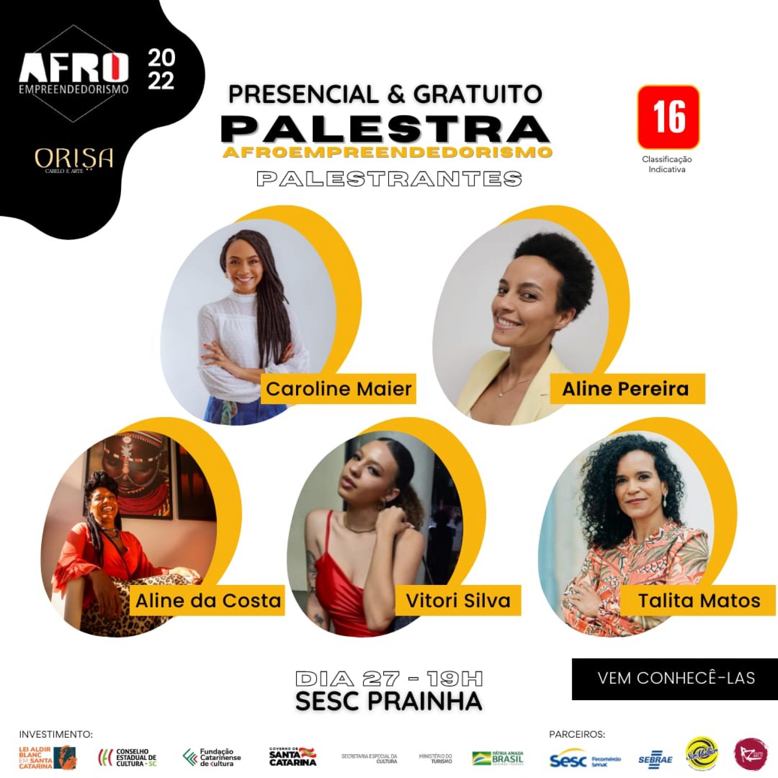 Nesta sexta-feira, dia 27 de maio, será lançado no Teatro do Sesc Prainha, em Florianópolis, o Projeto Estética Afro – Afro Empreendedorismo, com programação durante o final de semana. Na ocasião, haverá palestras da consultora financeira Aline da Costa Araújo, da analista técnica do Sebrae Aline Pereira, da administradora Caroline Maier, da antropóloga Talita Matos e da influenciadora Vitorí da Silva.