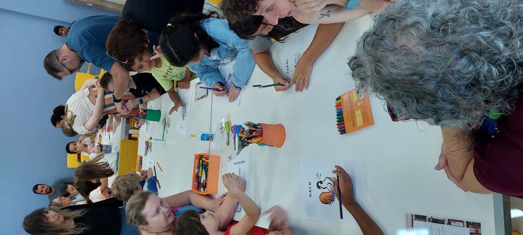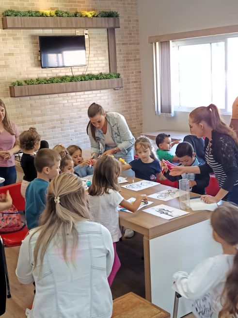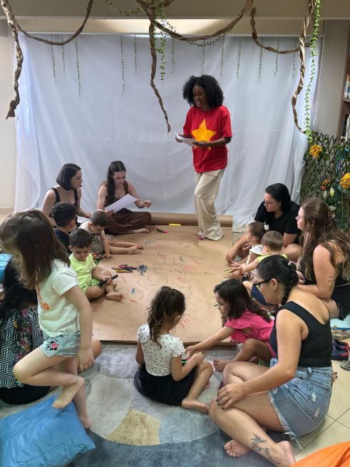 Em seguida, Laís conduziu uma oficina de escrita criativa, onde crianças e responsáveis se reuniram em torno de um grande papel craft no chão, desenhando e escrevendo palavras que rimavam. A atividade culminou na criação de um poema coletivo, feito a partir das palavras e rimas propostas pelos participantes, o que proporcionou uma experiência única de interação com a literatura.