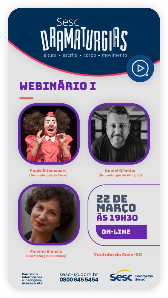 A programação traz ainda dois webnários conduzidos pelos ministrantes das oficinas, com transmissão pelo YouTube Sesc-SC. O Webnário I na abertura do projeto no dia 22.03, às 19h30, contará com a participação de Paula Bittencourt (Dramaturgia do Circo), Daniel Olivetto (Dramaturgia da Atuação) e Paloma Bianchi (Dramaturgia da Dança). O Webnário II, no dia 26.04, às 19h30, será conduzido por Alex de Souza (Dramaturgia da Encenação), Diego de Medeiros (Dramaturgia da Encenação) e Samira Sinara (Dramaturgia da Atuação).