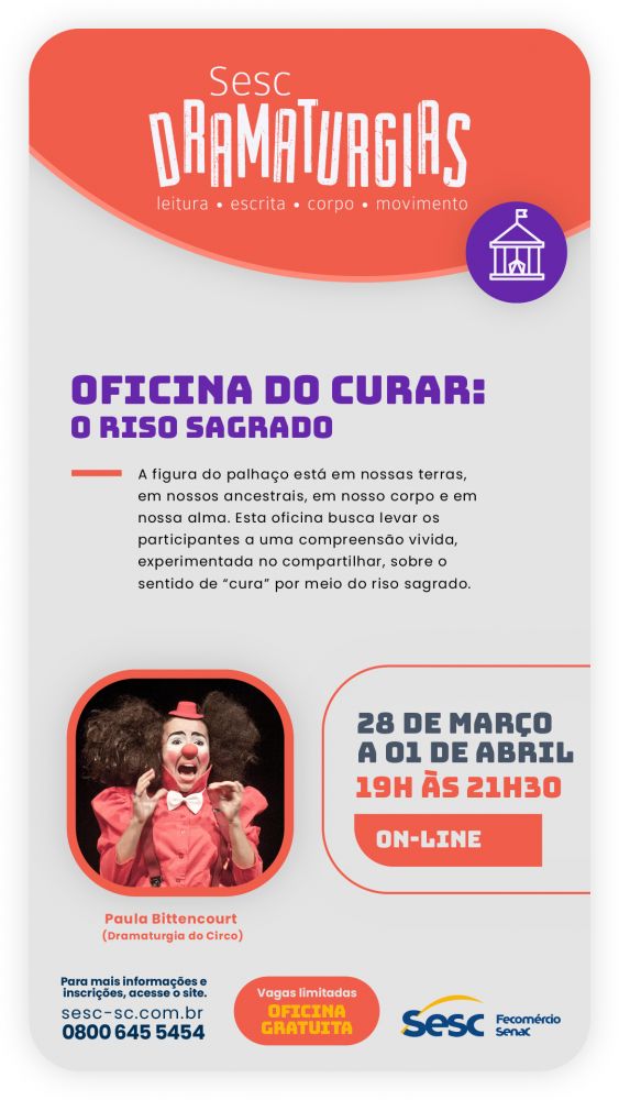 Sinopse: A figura do palhaço está em nossas terras, em nossos ancestrais, em nosso corpo e nossa alma. Esta oficina busca levar os participantes à uma compreensão vivida, experimentada no compartilhar, sobre o sentido de “cura” por meio do riso sagrado. Curar: realçar o sabor, realçar o que está bem, o que é bom. A palhaçaria coloca foco no que está bem, ela realça o sabor da pessoa, realça as coisas boas. E o que é bom? O que é belo? Muitas vezes é justamente o que tentamos esconder, o que não é aceito socialmente. E justamente nisso está a beleza de cada um, é em tudo aquilo que é muito particular de cada ser humano.