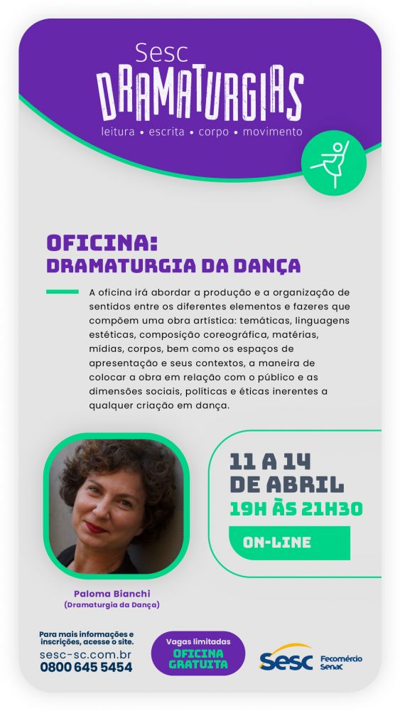 Sinopse: Tendo como foco principal o trabalho da pessoa dramaturgista nos processos de pesquisa e criação de obras de dança, a oficina irá abordar a produção e a organização de sentidos entre os diferentes elementos e fazeres que compõe uma obra artística: temáticas, linguagens estéticas, composição coreográfica, matérias, mídias, corpos, bem como os espaços de apresentação e seus contextos, a maneira de colocar a obra em relação com o público e as dimensões sociais, políticas e éticas inerentes a qualquer criação em dança.