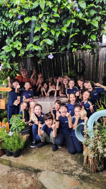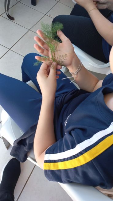 Na horta, conceitos abordados em sala, como "dentro-fora", "grande-pequeno", "cheio-vazio", texturas e cores, ganharam vida por meio da observação e interação direta com o ambiente. Um dos momentos mais marcantes foi a atividade conduzida pela Chef Marigilda Dalarosa, que apresentou às crianças como preparar compostagem, além de incentivá-las a plantar sementes de chás.