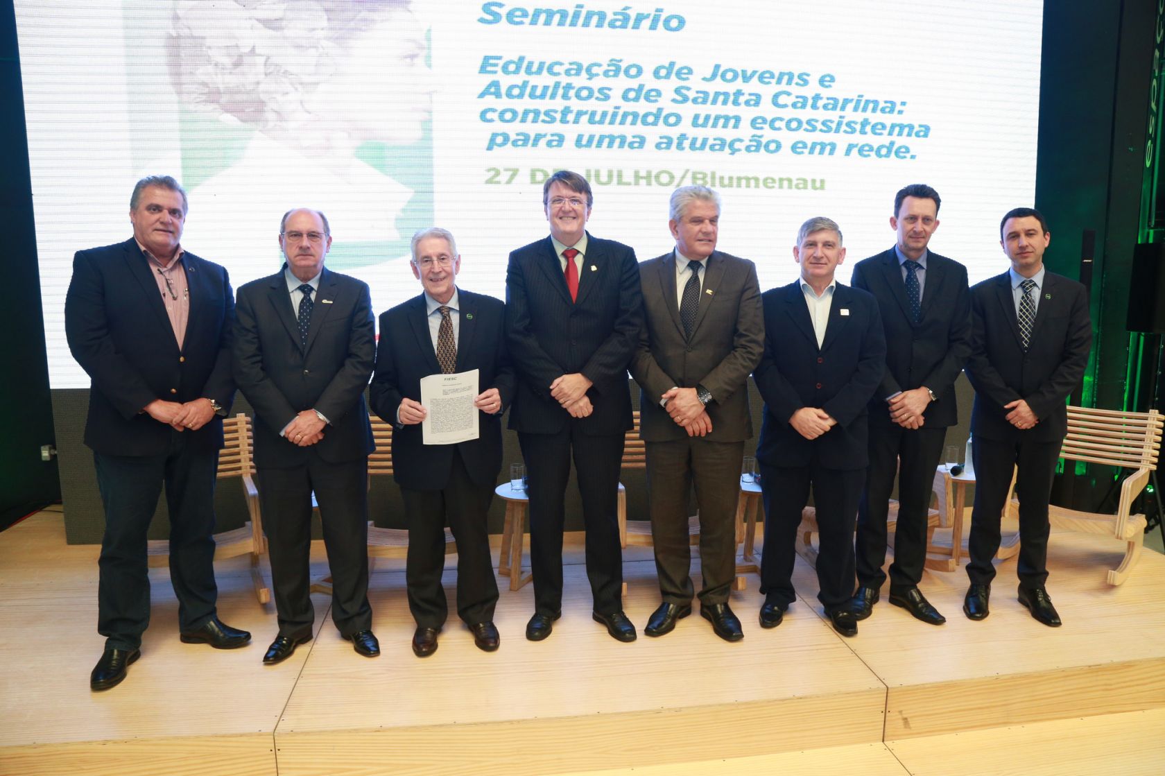 A Educação de Jovens e Adultos (EJA) foi tema do encontro nesta quinta-feira (27/07), que contou com a presença do secretário estadual de Educação, Eduardo Deschamps (PSD), ex-reitor da FURB. As Federações da indústria (Fiesc), do comércio (Fecomércio), da agricultura (Faesc) e dos transportes (Fetrancesc) promoveram o seminário Educação de Jovens e Adultos de Santa Catarina: construindo um ecossistema para uma atuação em rede. O evento foi realizado no Complexo Esportivo do Sesi, em Blumenau, e debateu a educação básica do trabalhador com a participação do especialista Timothy Ireland, coordenador da Cátedra da Unesco em EJA. O evento contou também com a presença do Presidente da Fecomércio, Diretores Regionais do Sesc, Senac e equipe.