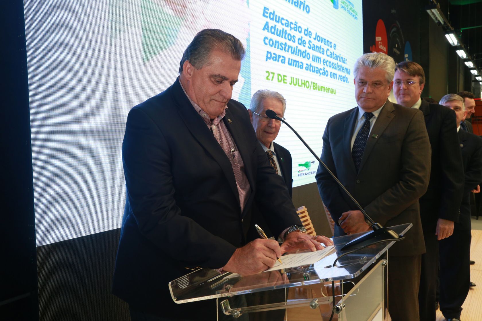 Durante o encontro as entidades envolvidas assinaram termo de cooperação oficializando a parceria para ampliar a oferta de educação de jovens e adultos no Estado. A partir de uma plataforma de geolocalização disponível no site www.scpelaeducacao.com.br, será possível a qualquer estudante encontrar a escola de educação de jovens e adultos mais próxima. Todas as escolas ofertantes estarão indicadas nessa plataforma. São oferecidos cursos em 201 municípios, somando 421 estabelecimentos em que as aulas são realizadas.