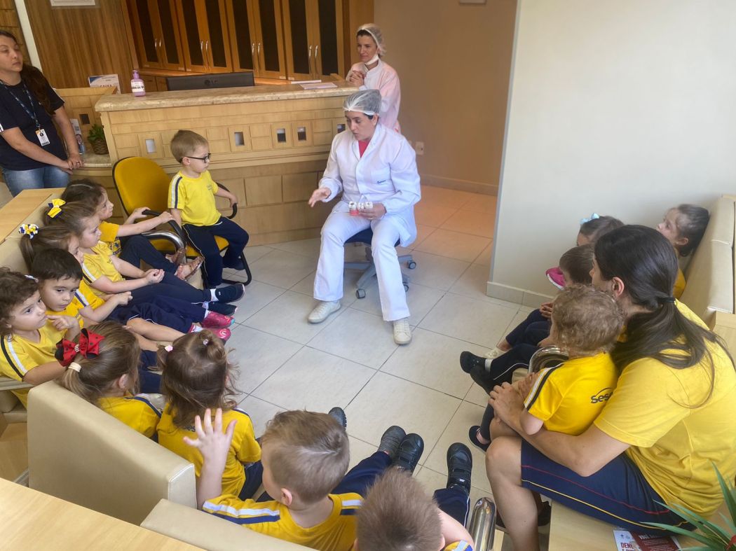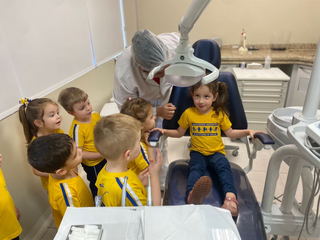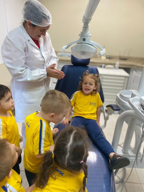 O que acontece com os dentes das crianças quando se usa muito bico ou mamadeira? Para responder a essa e outras questões relacionadas à saúde bucal dos primeiros anos de vida, a Turma da Alegria do Sesc Chapecó contou com o apoio da equipe da clínica de saúde da Unidade, que reuniu os alunos da educação infantil da escola Sesc em uma visita especial ao dentista.