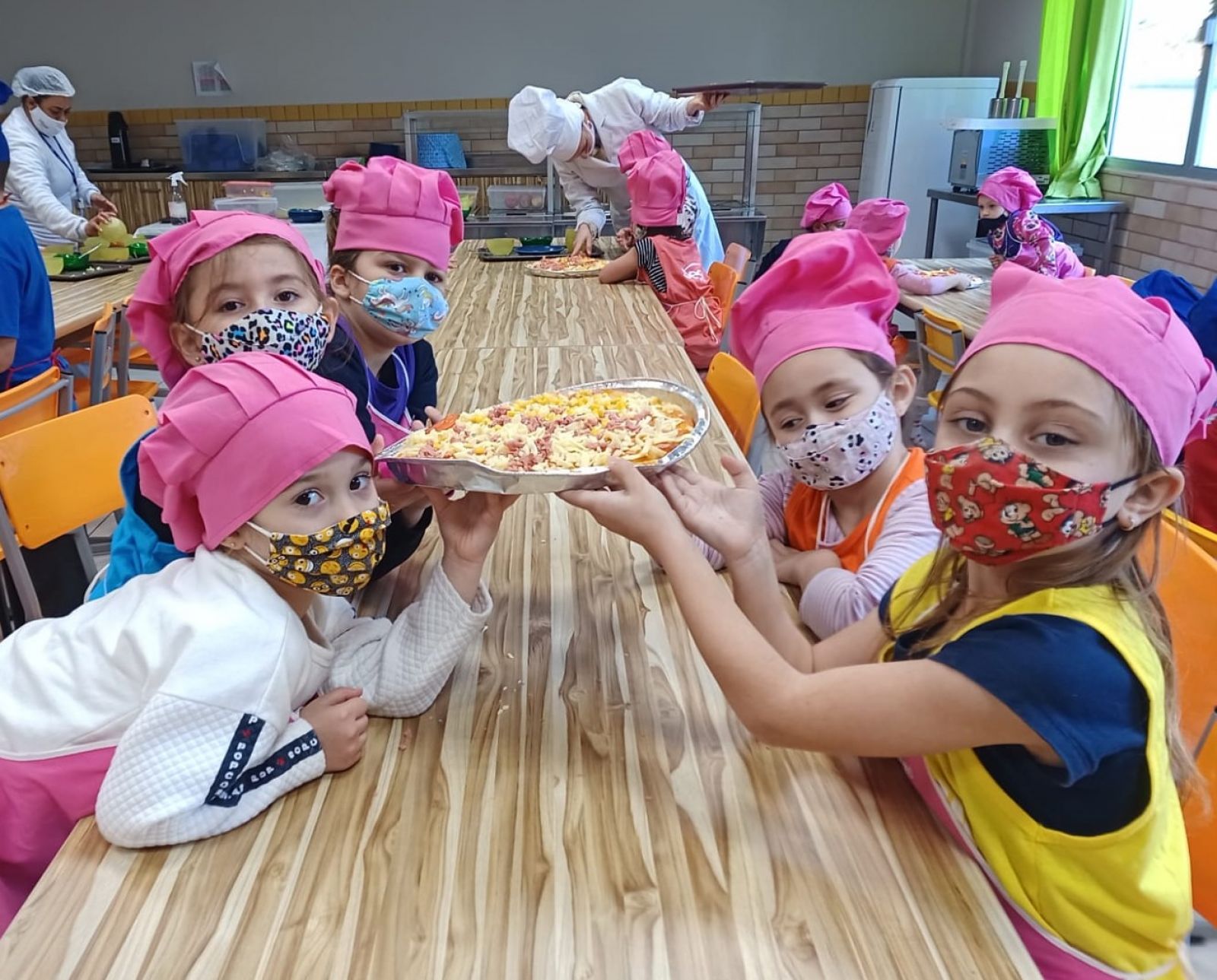 Na primeira semana, as crianças puderam preparar as pizzas para seu próprio lanche, colocando o molho, queijo, os recheios de acordo com as preferências. Alguns participantes relataram que também faziam pizza com os pais em suas casas e já eram craques nessa arte, mesmo assim acharam muito divertido e adoraram degustar suas preparações no lanche.
