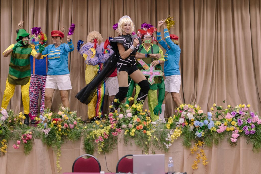 Logo nas primeiras atividades, as equipes demonstraram todo o seu engajamento com apresentações de bandeiras personalizadas e covers musicais. Destaque para as performances animadas que marcaram a noite de abertura: Itajaí trouxe o clássico “Y.M.C.A.” do Village People; Tijucas relembrou a era da Xuxa; Criciúma reviveu Wanderléa com a música “Pare o Casamento”; Lages homenageou a banda Grafite com “Mamma Maria”; Joinville levantou a torcida ao som de “Fuscão Preto”, do Trio Parada Dura; Chapecó trouxe o tradicionalismo gaúcho com Elton Saldanha e a música “Não Chora China Véia”; e Florianópolis encerrou com o cover das Empreguetes.