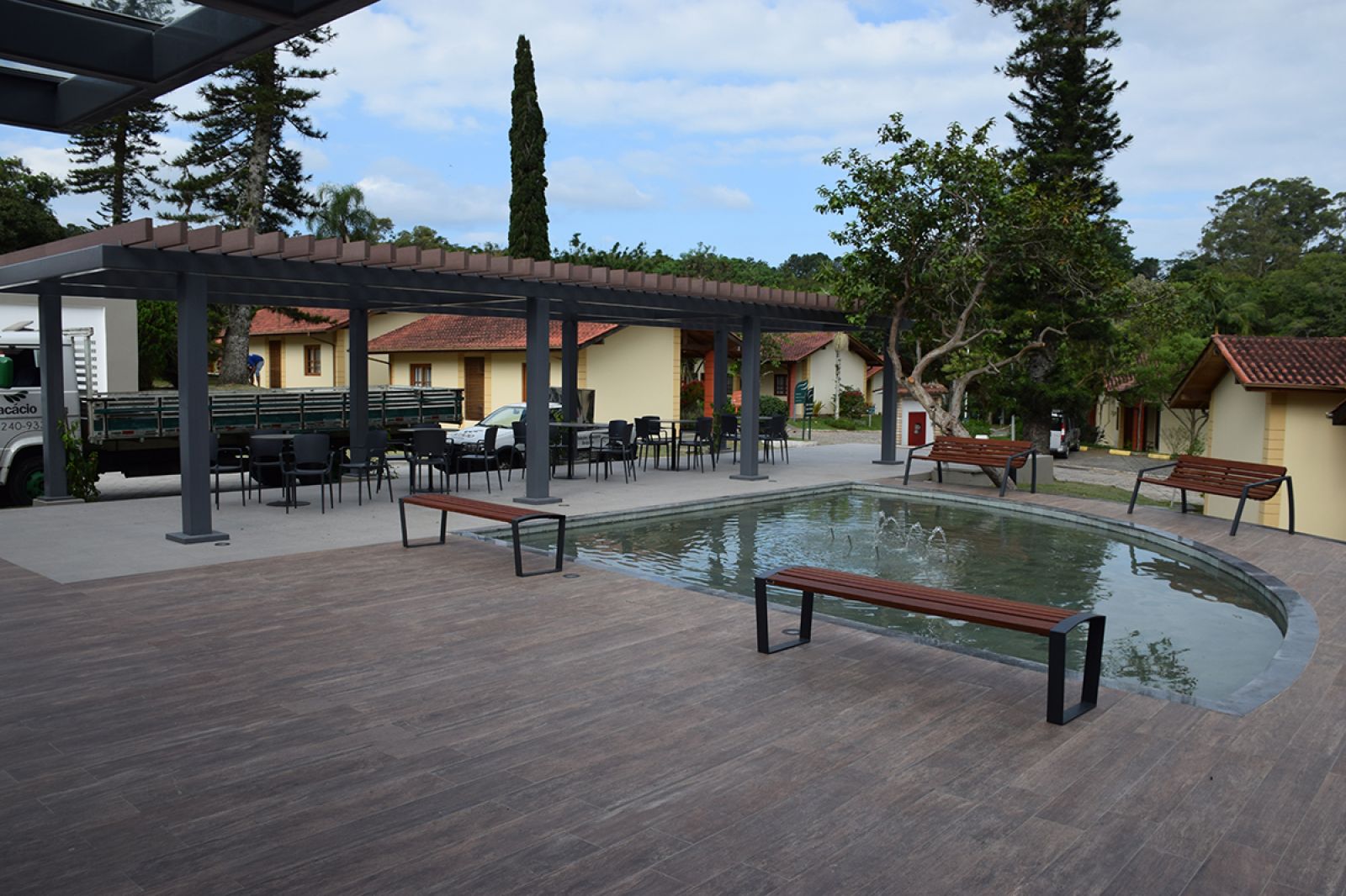 Na parte externa, uma praça com chafariz rodeado por bancos, além de mesas para convivência para acolher ainda melhor os clientes na chegada e na saída das refeições.