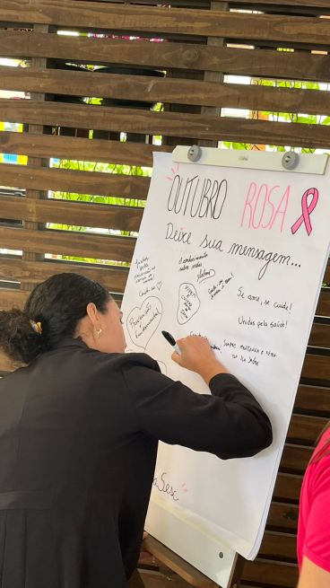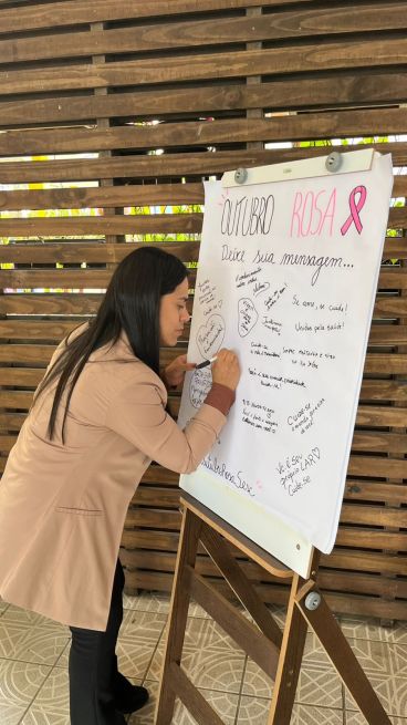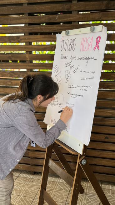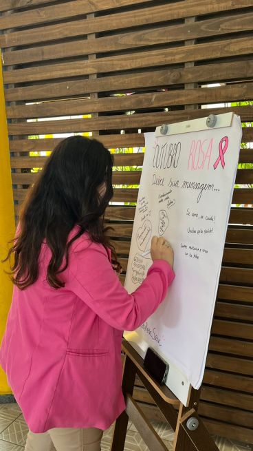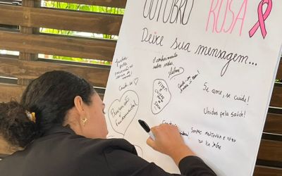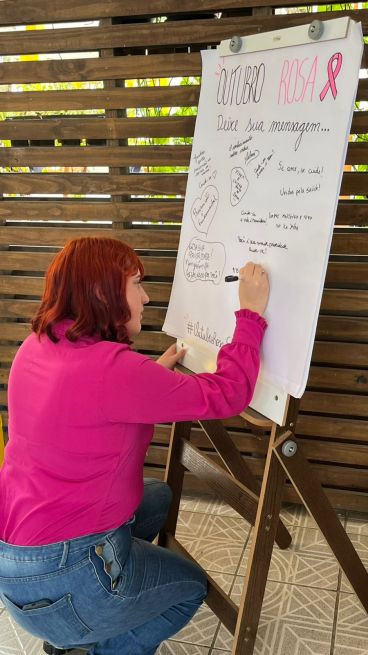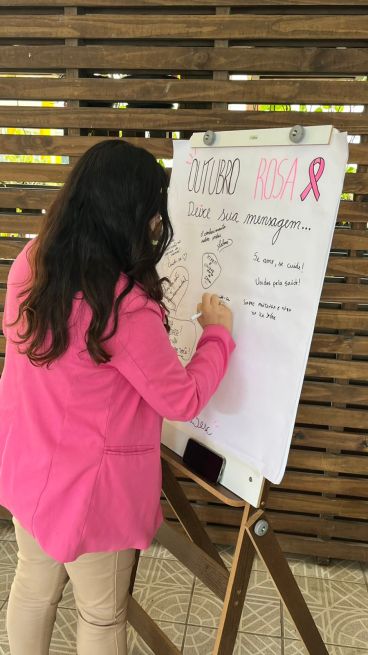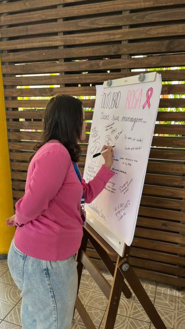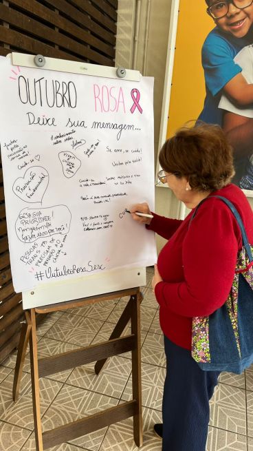 As iniciativas do Outubro Rosa no Sesc-SC contou com a participação de colaboradores e clientes, que vestiram camisetas rosas em apoio à campanha e contribuíram para criar um ambiente de solidariedade. A cor símbolo do movimento esteve presente em toda a programação, reforçando o compromisso coletivo com a causa.