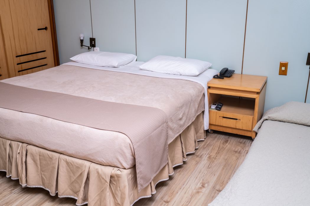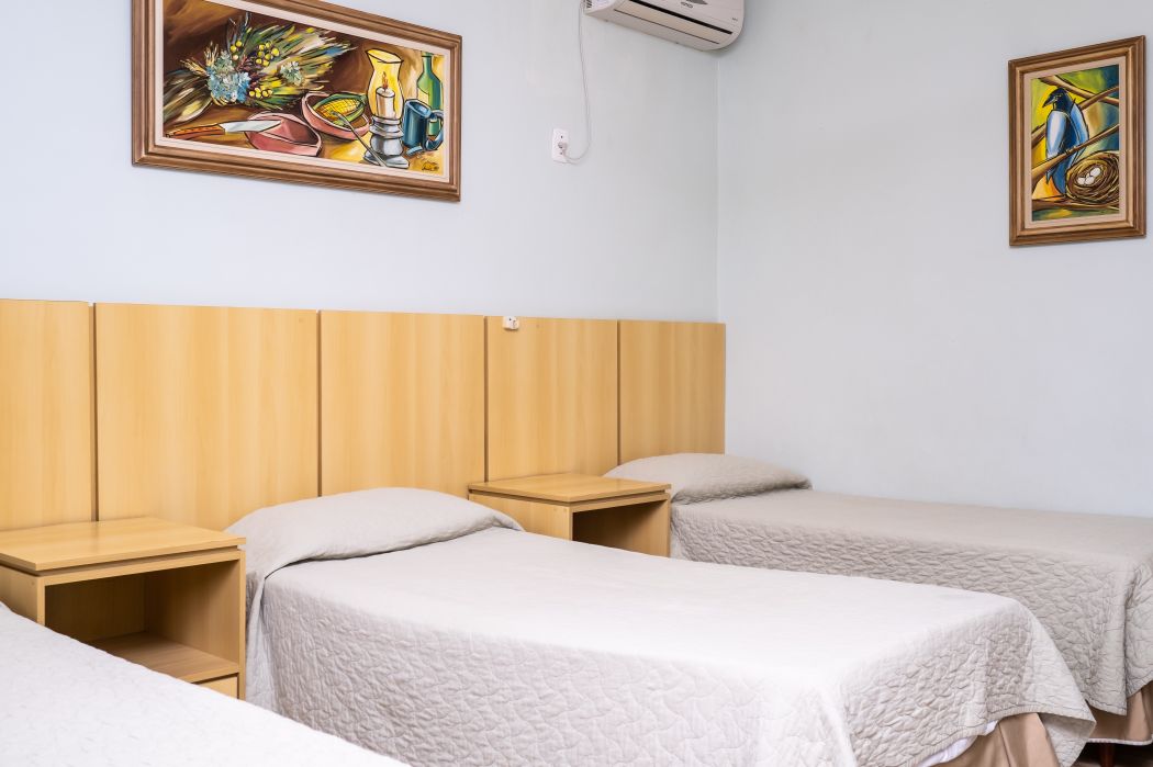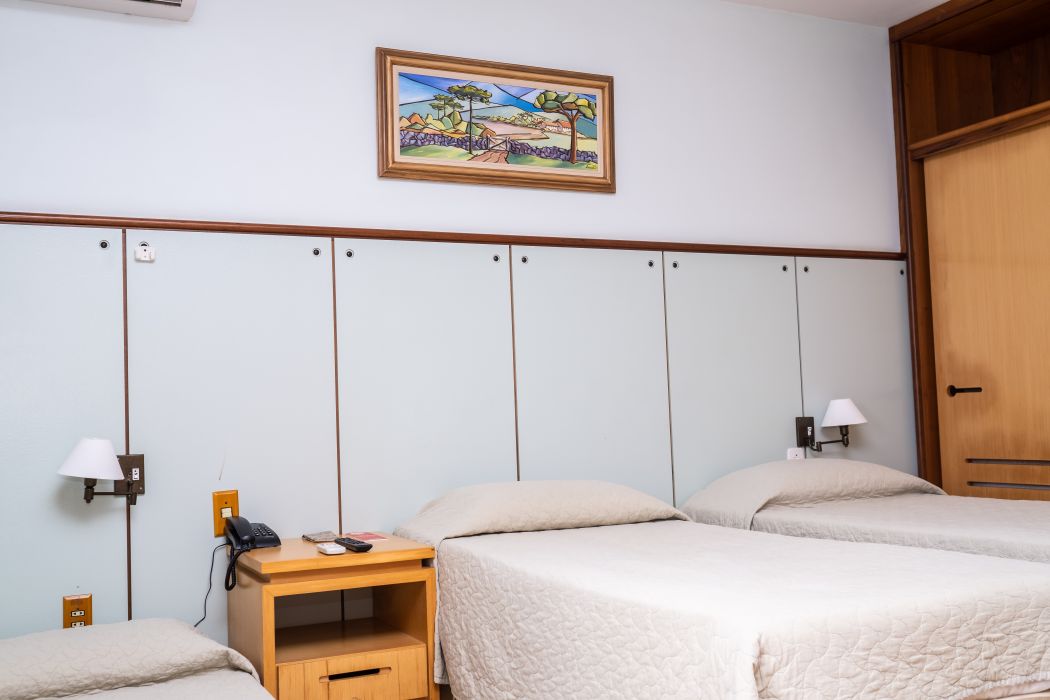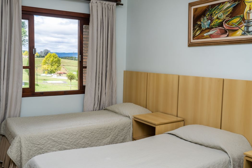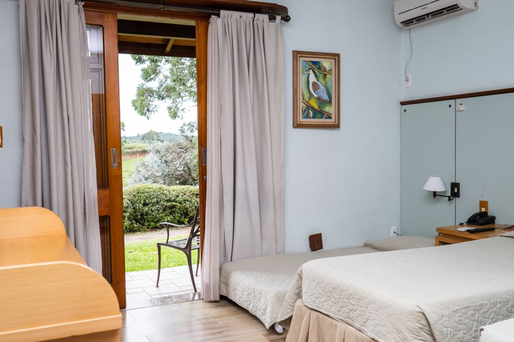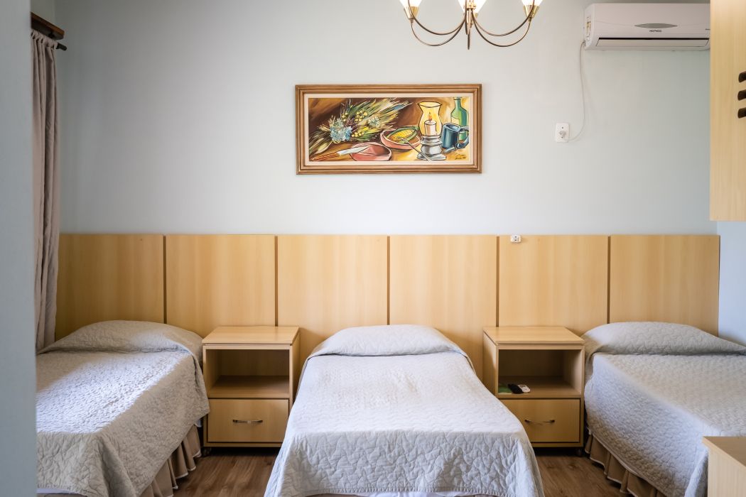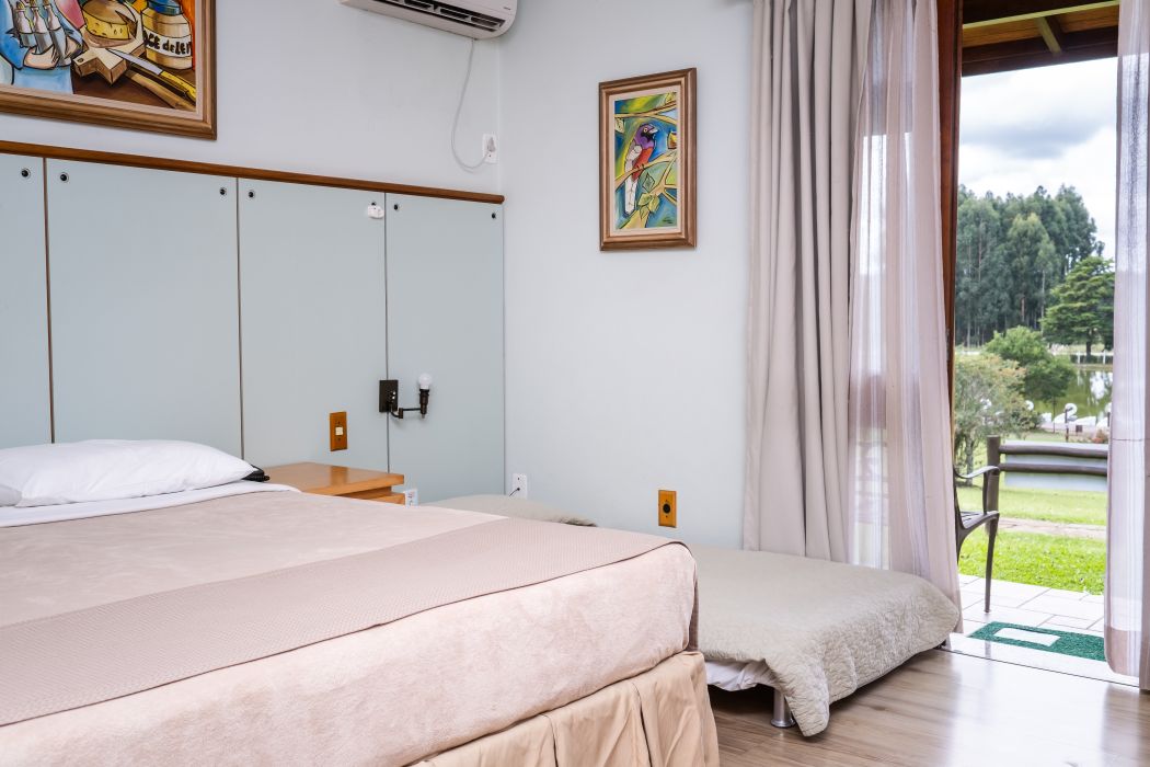 O quarto triplo é ideal para quem está viajando em família ou amigos. Espaço aconchegante e tranquilo com vista para o lago. Opção de cama de casal + solteiro, ou três camas de solteiro.