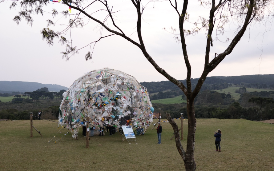 A estrutura geodésica de bambu foi construída e revestida com resíduos plásticos doado pelos estudantes da rede de ensino do município de Lages, através de atividades de educação ambiental no primeiro semestre de 2024. Tem o diâmetro de 9 metros, altura de 6,8 metros e dentro dela serão expostas imagens (60x90 cm) de organismos epiplásticos, fotografados via microscopia eletrônica de varredura.