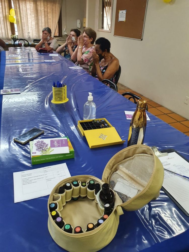 Os participantes puderam conhecer sobre as propriedades dos óleos essenciais mais usados como a Lavanda, Peppermint, Copaíba, Alecrim, Laranja Doce, Melaleuca e Eucalipto. Os idosos também foram orientados sobre a sua aplicação e o uso seguro visando o autocuidado.