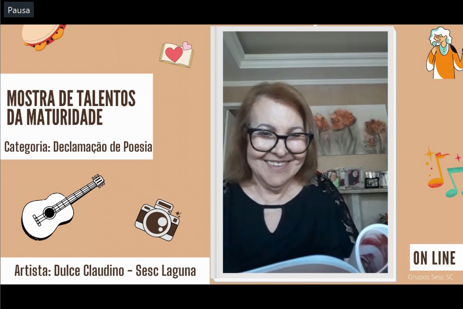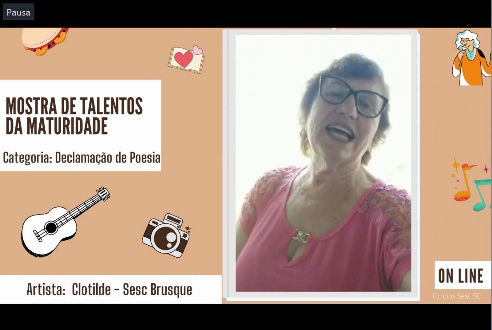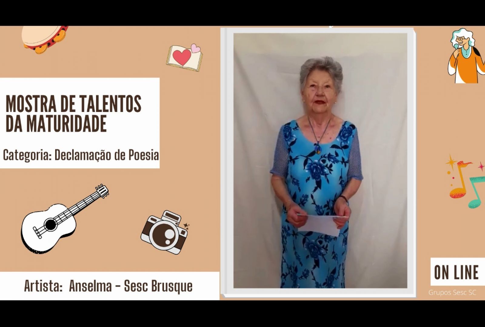 O público 60+ que frequentou as atividades virtuais oferecidas pela Instituição em 2020 foi convidado para participar da 5ª Mostra de Talentos da Maturidade, edição On-line, realizada pelo Sesc Laguna. Os participantes, de Tubarão, Brusque, Pescaria Brava e Laguna, puderam apresentar suas habilidades e potencialidades artísticas e culturais nas modalidades: canto, música, dança, poesia, expressão corporal, contação de causo e fotografia, este com o tema: “Nascer e Pôr do Sol”.