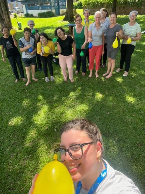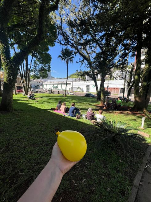 Entre bexigas coloridas e muita água, os participantes se envolveram na divertida Guerra de Bexiga d’Água, uma atividade que uniu descontração, socialização e desafios motores. Teve circuito, bexigas lançadas de um lado para o outro e muita risada a cada explosão de água.
