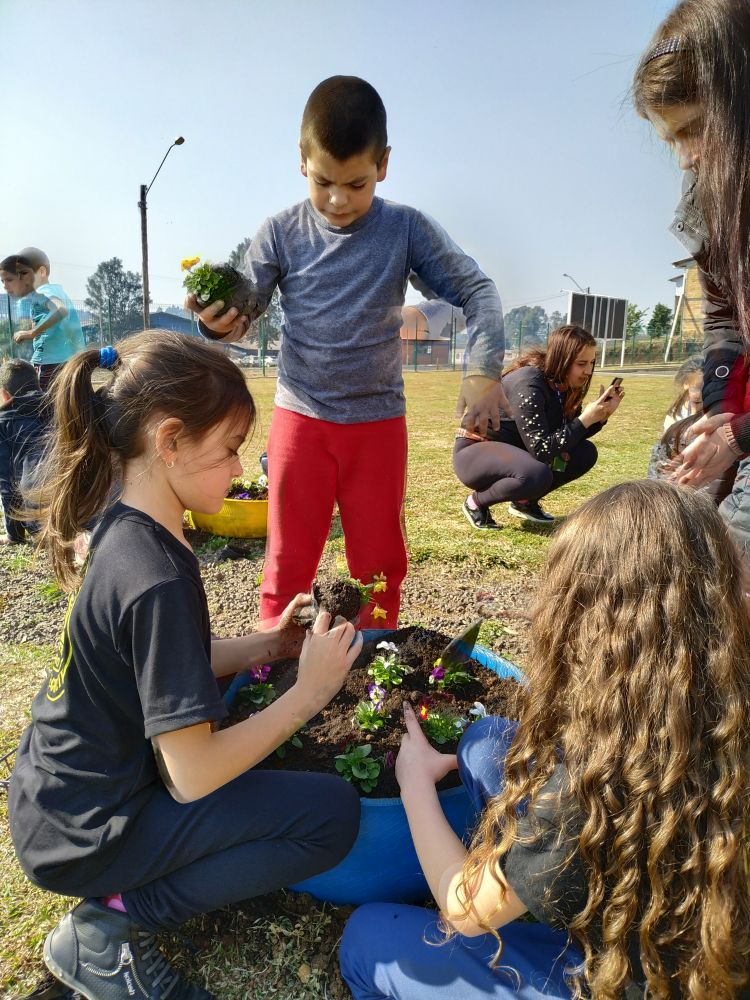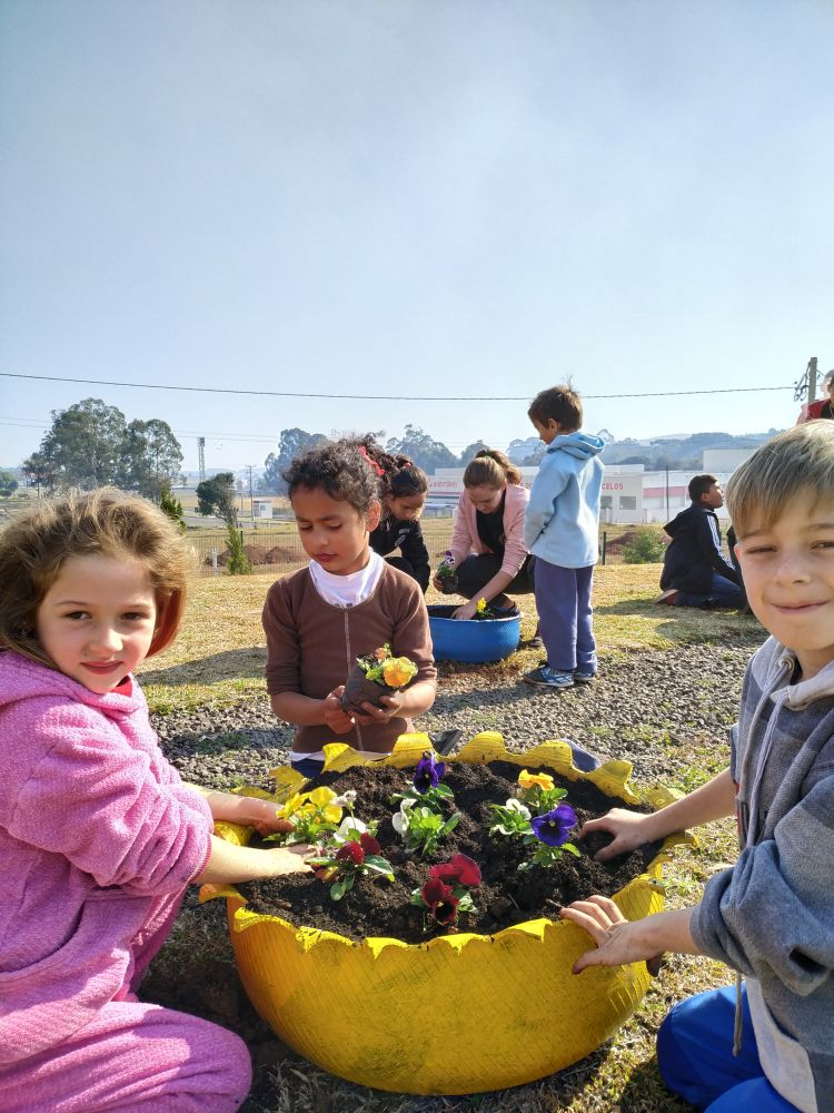 Após a decoração dos pneus, os alunos do curso de capoeira e do serviço de convivência e fortalecimento de vínculos ajudaram na oficina para plantar e cultivar flores nos pneus, que foram reutilizados e pintados e agora embelezam os espaços do Sesc Comunidade em Irani. A ação contou com 25 alunos, sob orientações da oficineira Elisangela Marcon.