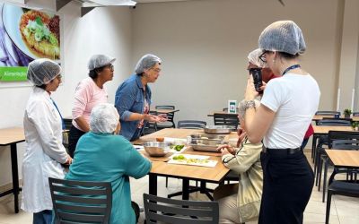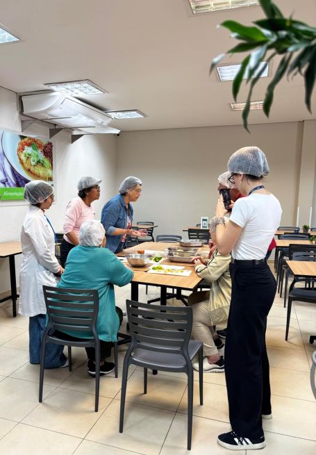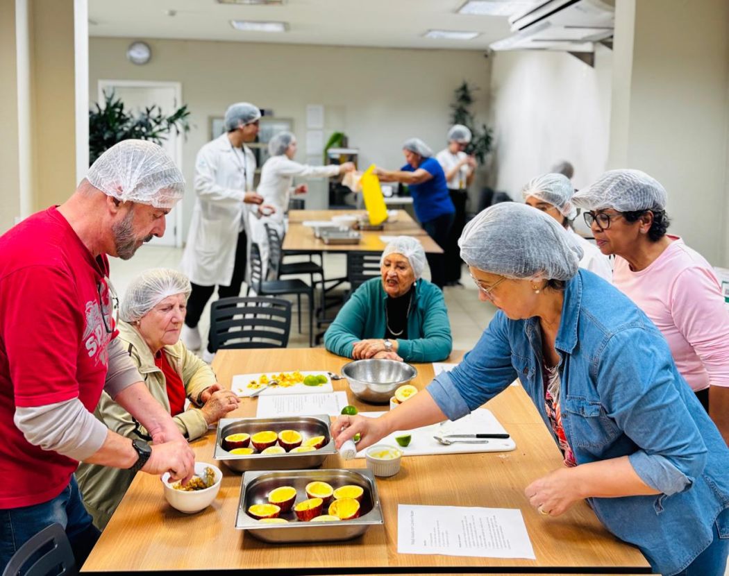 Na atividade, o conhecimento técnico das nutricionistas se somou às experiências de vida dos participantes 60+. O encontro foi marcado por entusiasmo: antes mesmo do início oficial, muitos já se reuniam em volta da bancada, ansiosos para colocar a mão na massa e iniciar o preparo das receitas.