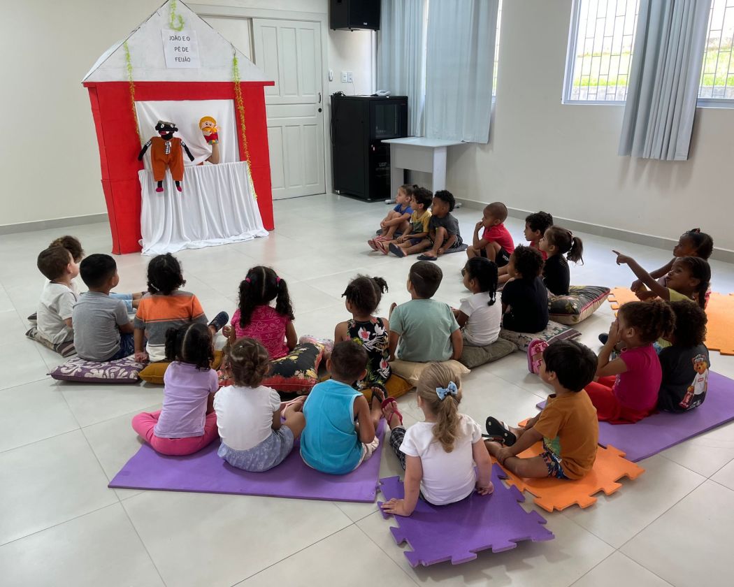 Nas primeiras ações de 2025, foi realizada uma contação de história com o uso de fantoches — uma metodologia lúdica, adaptada às faixas etárias de 3 a 5 anos — garantindo que o aprendizado fosse, além de informativo, também divertido e reflexivo. A história escolhida foi João e o Pé de Feijão, de Cardoso, F.; Holanda, P.; e Almeida, S. (2019), adaptada para abordar o primeiro passo do Guia Alimentar para a População Brasileira: “Fazer de alimentos in natura ou minimamente processados a base da alimentação.”