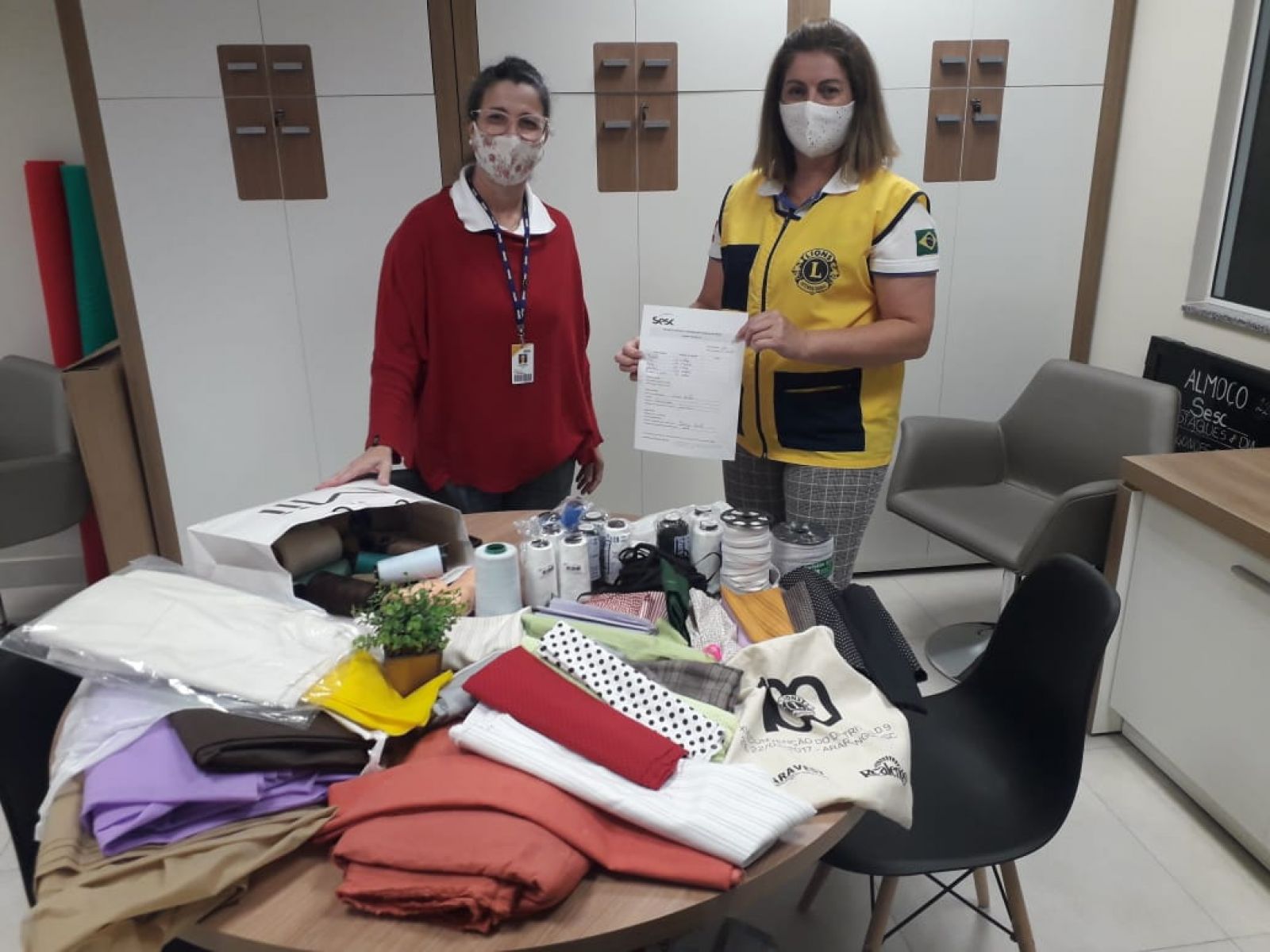 Continuamos arrecadando tecidos 100% algodão, TNT, malha/fio de malha, tesoura de tecido, agulhas, linhas, elásticos. Podem doar pessoas físicas ou empresas, e é preciso fazer contato com a Unidade do Sesc Santa Catarina da sua região para agendar a entrega, que vamos até o local receber o material.