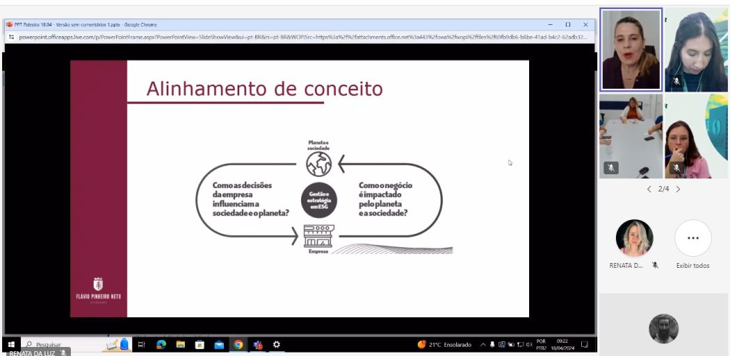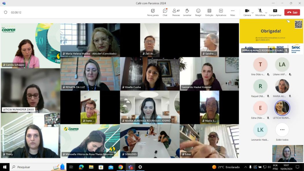 Em Blumenau, os parceiros reuniram-se virtualmente, e contaram com a participação da Sharon Haskel Koepsel, que falou sobre os indicadores ESG para empresas que doam e Organizações Sociais que recebem alimentos ao Programa Sesc Mesa Brasil, e compartilhou a sua experiência com a economia circular e o desenvolvimento sustentável, como coordenadora do núcleo de sustentabilidade da Associação Comercial e Industrial de Blumenau e Colíder da filial SC do Capitalismo Consciente.