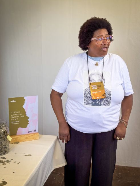 Durante o festival, ela integrou a programação da Tenda do Cuidado com a vivência “Cuidado com Ervas: Saberes que Curam”, apresentando ervas medicinais e oferecendo chás voltados ao relaxamento, alívio de dores e fortalecimento da imunidade. A ação reforçou a importância do conhecimento tradicional no cuidado coletivo e no bem-estar comunitário, valorizando práticas simples, acessíveis e profundamente enraizadas na cultura quilombola.