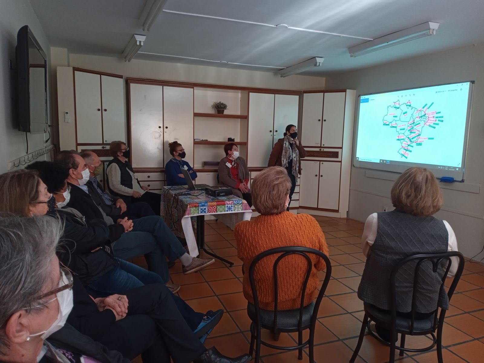 Os idosos integrantes do Grupo da Memória do Sesc Blumenau participaram na quarta-feira (21/07) de um encontro que envolveu a recordação de suas viagens, em parceria com a área do Turismo. A atividade iniciou com a projeção do mapa do Brasil, e cada participantes incluiu nele os nomes dos Estados e depois das Capitais. Nesse sentido, com o mapa completo, o grupo analisou sobre a extensão do nosso país, assim como os locais que já haviam visitado e também aqueles que gostariam de conhecer.