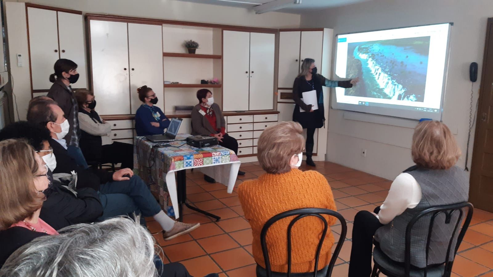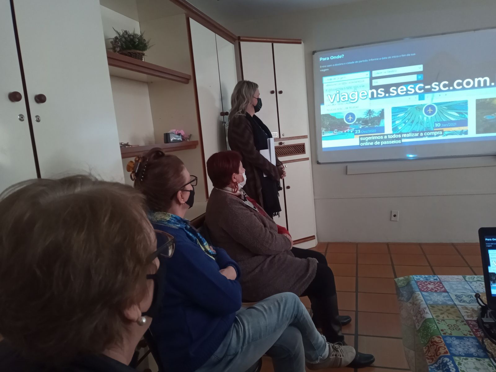 Posteriormente, a técnica de Turismo do Sesc Blumenau, Flávia Suziany Gebien apresentou vídeos sobre os hotéis do Sesc em Santa Catarina e as medidas sanitárias que a Instituição realiza para prevenção da Covid-19 nas viagens. Após esse momento, foi mediada uma atividade em que os idosos puderam lembrar dos locais turísticos de roteiros promovidos pelo Sesc, através da projeção de algumas fotos. Durante a explanação, em roda de conversa, os participantes puderam contar se já conheciam aquele roteiro e qual foi a sua experiência em viajar com o Sesc.
