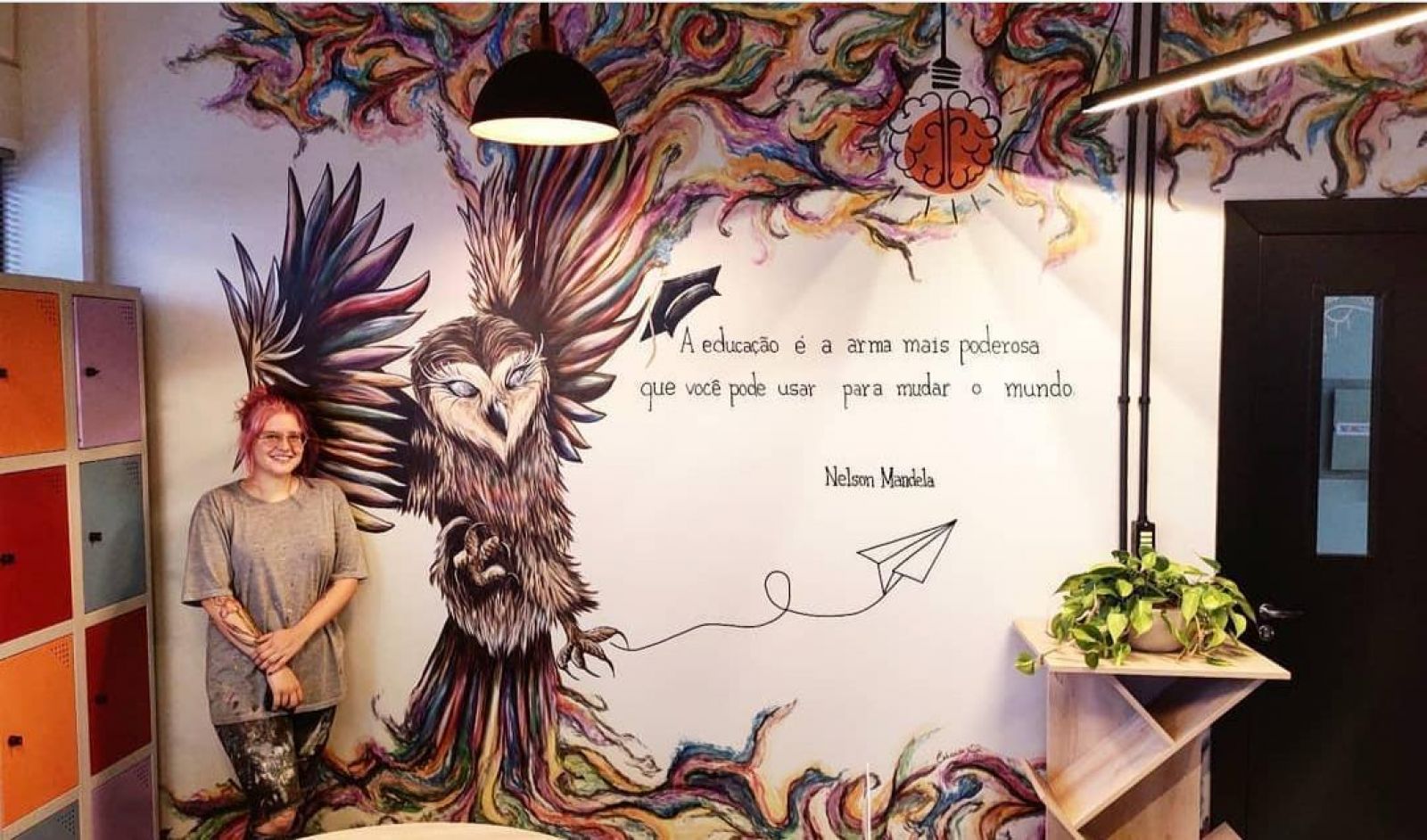 "Sou Eduarda Negri, tenho 22 anos e atualmente trabalho com a arte sendo muralista. Há 10 anos iniciei o curso de Pintura em Tela e Desenho no Sesc, como um hobbie.