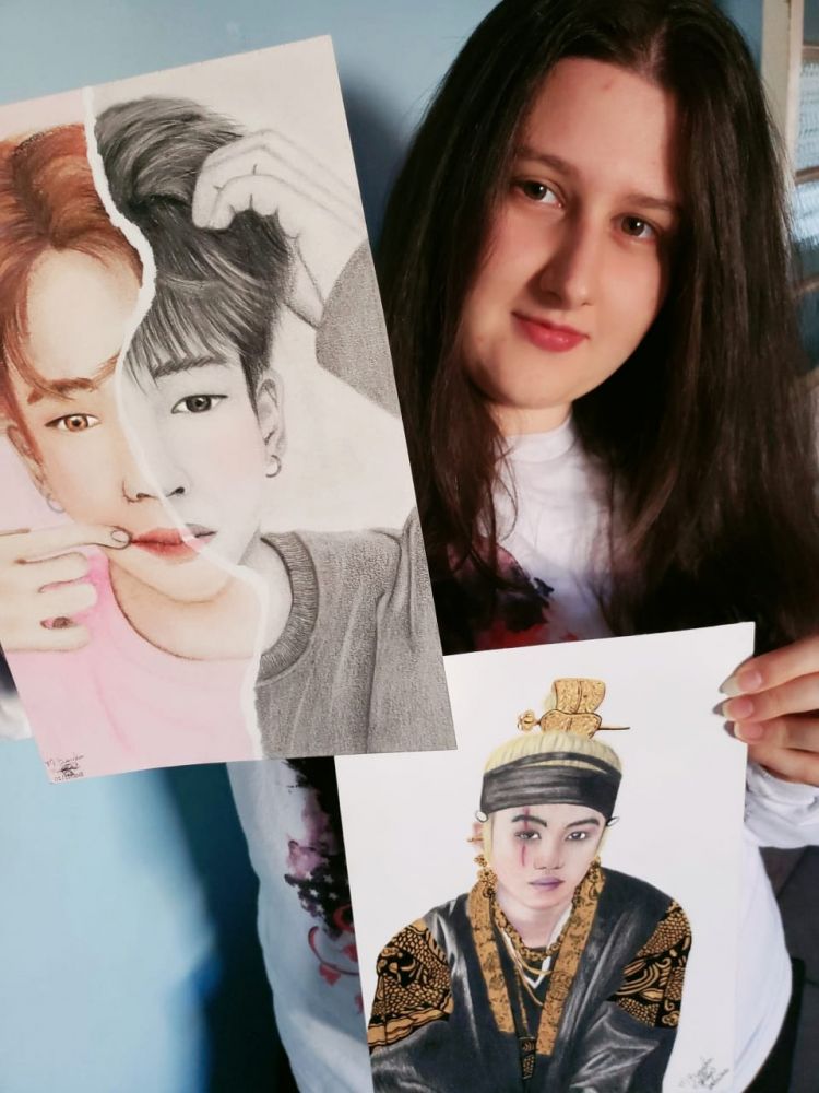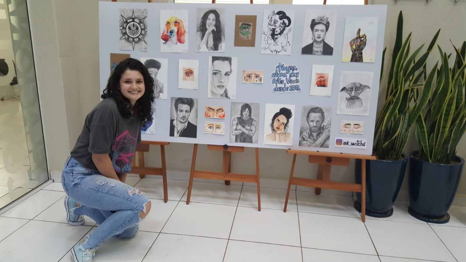 "A arte esteve presente em toda a minha vida, desde pequena, sempre querendo desenhar, sempre querendo me expressar desse modo, um jeito que eu encontrei de trabalhar com o meu lado criativo foi na oficina de artes visuais do Sesc, onde, com orientação, pude melhorar meu trabalho e evoluir como artista. O que vocês estão vendo é o resultado disso, a arte não é talento, muito menos dom, desenhar é prática, é esforço e dedicação, a arte requer treino, e portanto, qualquer um pode desenhar."