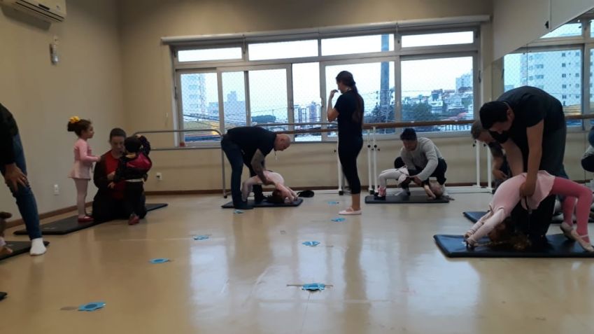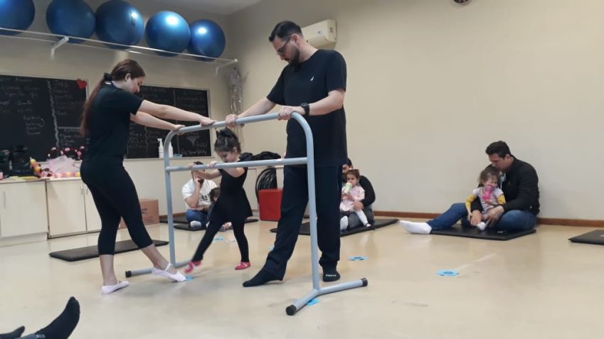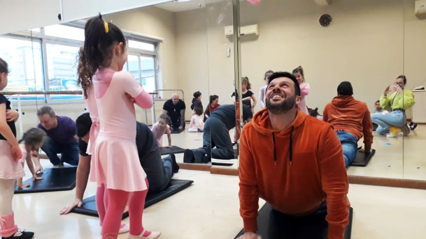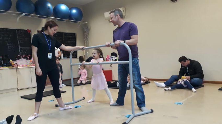 Os papais acompanharam e auxiliaram as pequenas bailarinas durante os exercícios de aquecimento e, em seguida, elas roubaram a cena, ensinando os passos de ballet e colocando os convidados para dançar ao lado delas.