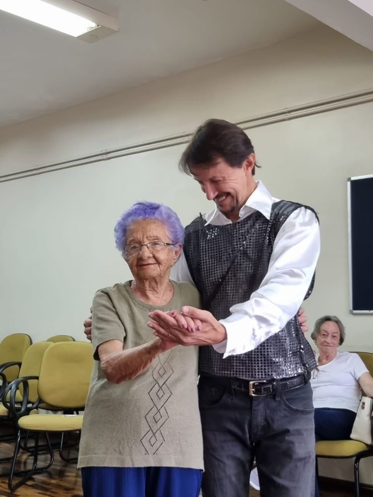 “Para mim, a tarde mais feliz do mundo foi hoje, devia ter toda tarde esse moço dançando com a gente. A dança é a melhor coisa do mundo. Eu aprendi a dançar com meu pai, eu tinha 8 anos, ele era professor de dança, a primeira valsa que eu dancei com ele eu tinha 13 anos e continuo dançando até hoje. Meu marido também era dançador e eu sou mais ainda, danço sozinha em casa, fecho a porta do quarto e danço com a vassoura” confessa Irene Silva Daldasso, 98 anos.