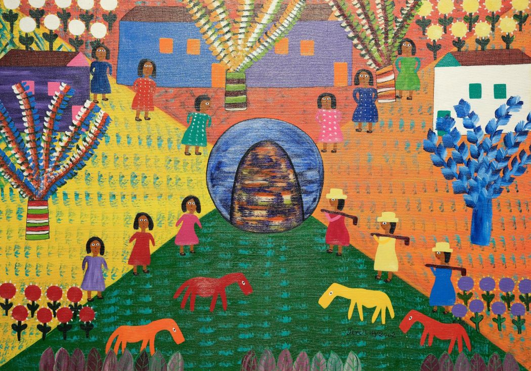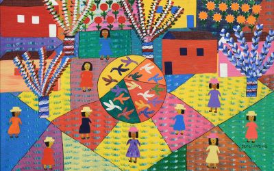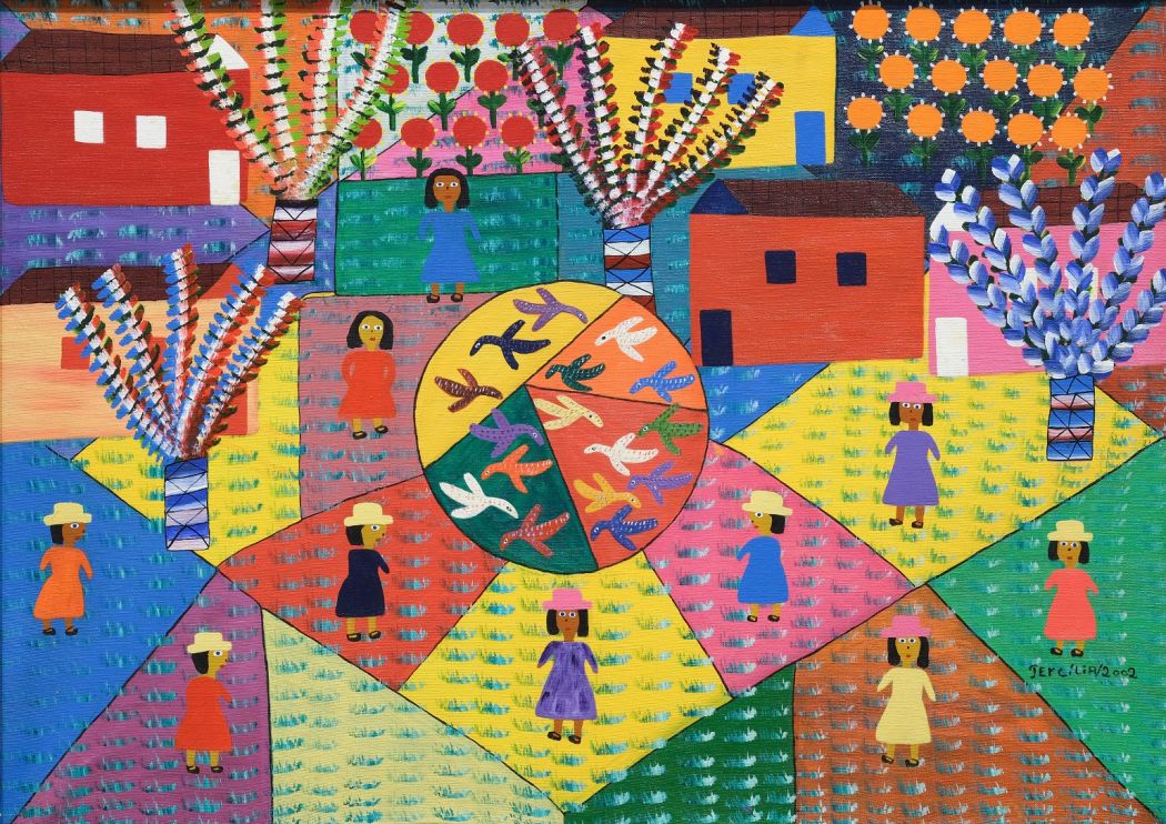 Desde então, inspirada por suas memórias de infância, a artista constrói um rico universo vibrante, repleto de cores que evocam cenários com arvoredos, flores, casas, animais e crianças. Natural de Piratuba, município do Oeste catarinense, sua produção encontra na paisagem local e nos temas regionais os elementos essenciais para suas criações, que refletem essa conexão com o espiritual e o invisível, suas percepções sensoriais e memória. Todo o repertório construído pela artista é observado nos quadros de pincelada marcante que recorre à técnica de acrílica sobre tela.