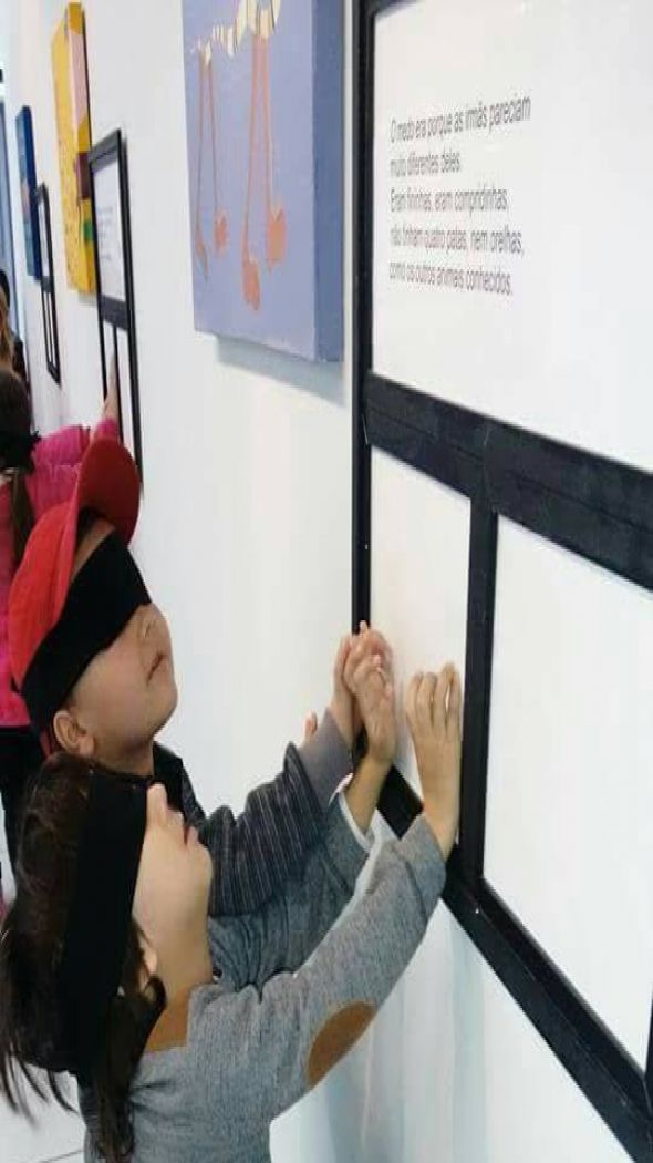 A mediadora da exposição vendou os olhos dos pequenos e eles puderam entrar na galeria e colocar as mãozinhas em todas as obras. “A gente vai poder colocar as mãos na arte?” – perguntava o Arthur de apenas 04 anos de idade. “É muito difícil ver com as mãos!” – reclamava o pequeno Rodrigo, que de vez em quando dava uma “espiadinha” através da venda. Os pequenos visitantes vendaram seus olhos e tocaram na obra.