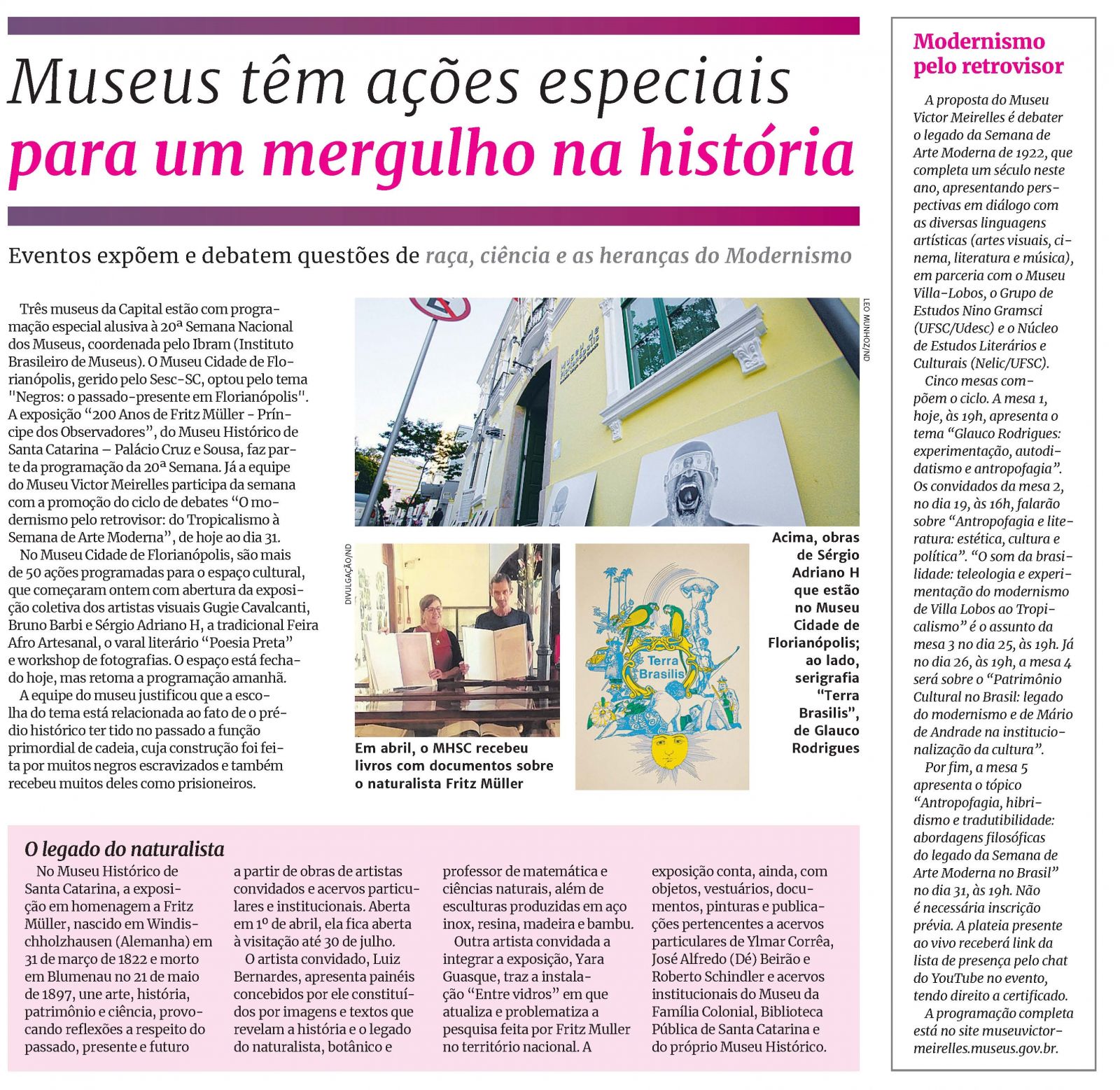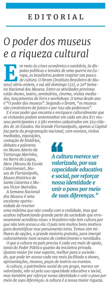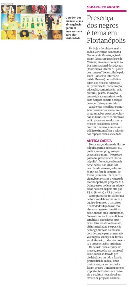 De 16 a 22 de maio, o Museu de Florianópolis, gerido pelo Sesc-SC, participa da 20ª edição da Semana Nacional de Museus. São mais de 50 ações com o tema "Negros: o passado-presente em Florianópolis", como: oficinas temáticas, palestras, exposições artísticas, feira de afroartesanato, exibição de filmes, varal literário, rodas de conversa, apresentações artísticas, e visitas mediadas com destaque para as narrativas negras.