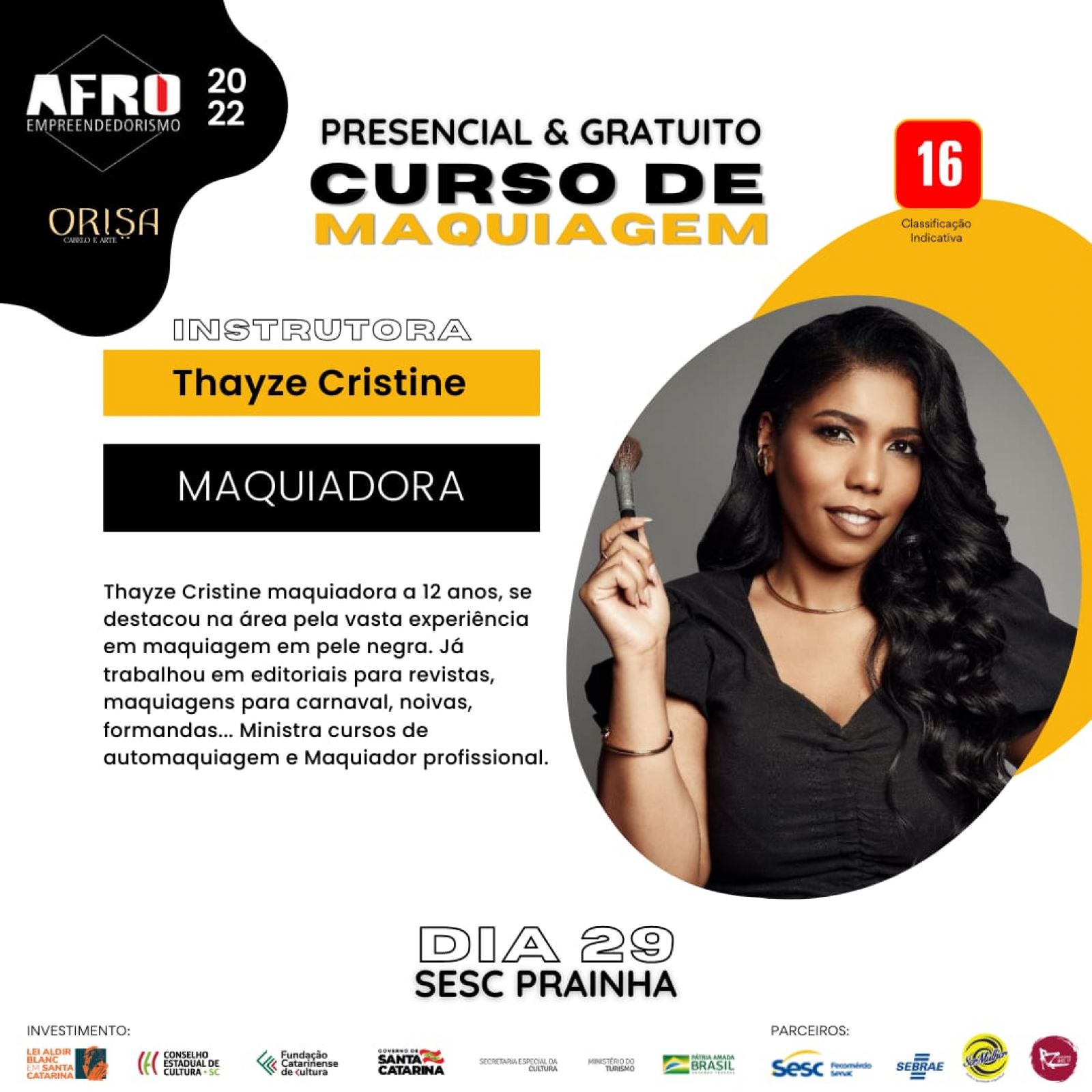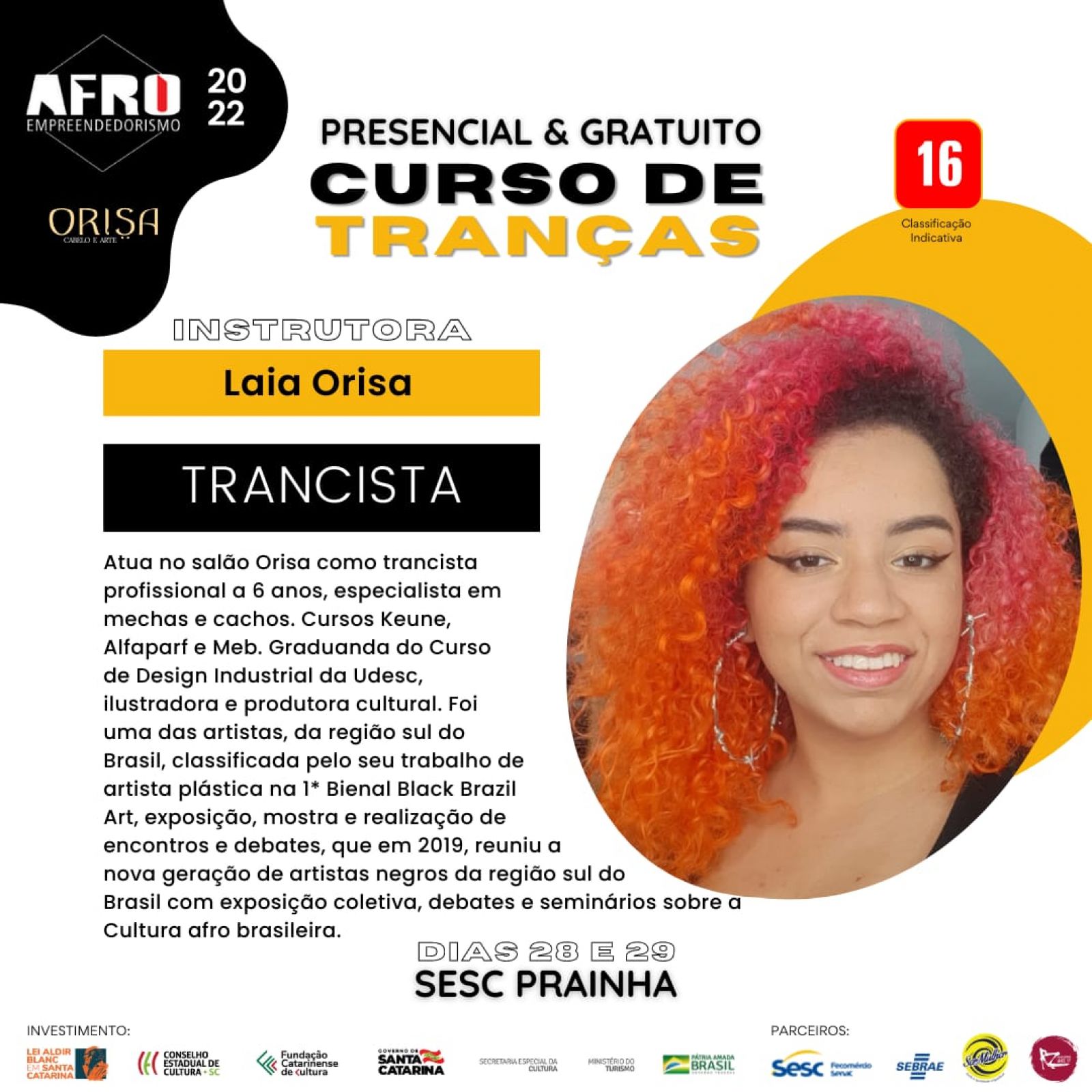 Nos dias 28 e 29, a trancista Laia Orisa ensinará a fazer tranças afro nos cabelos; e, no dia 29, Thayze Cristine dará um curso de maquiagem em pele negra.