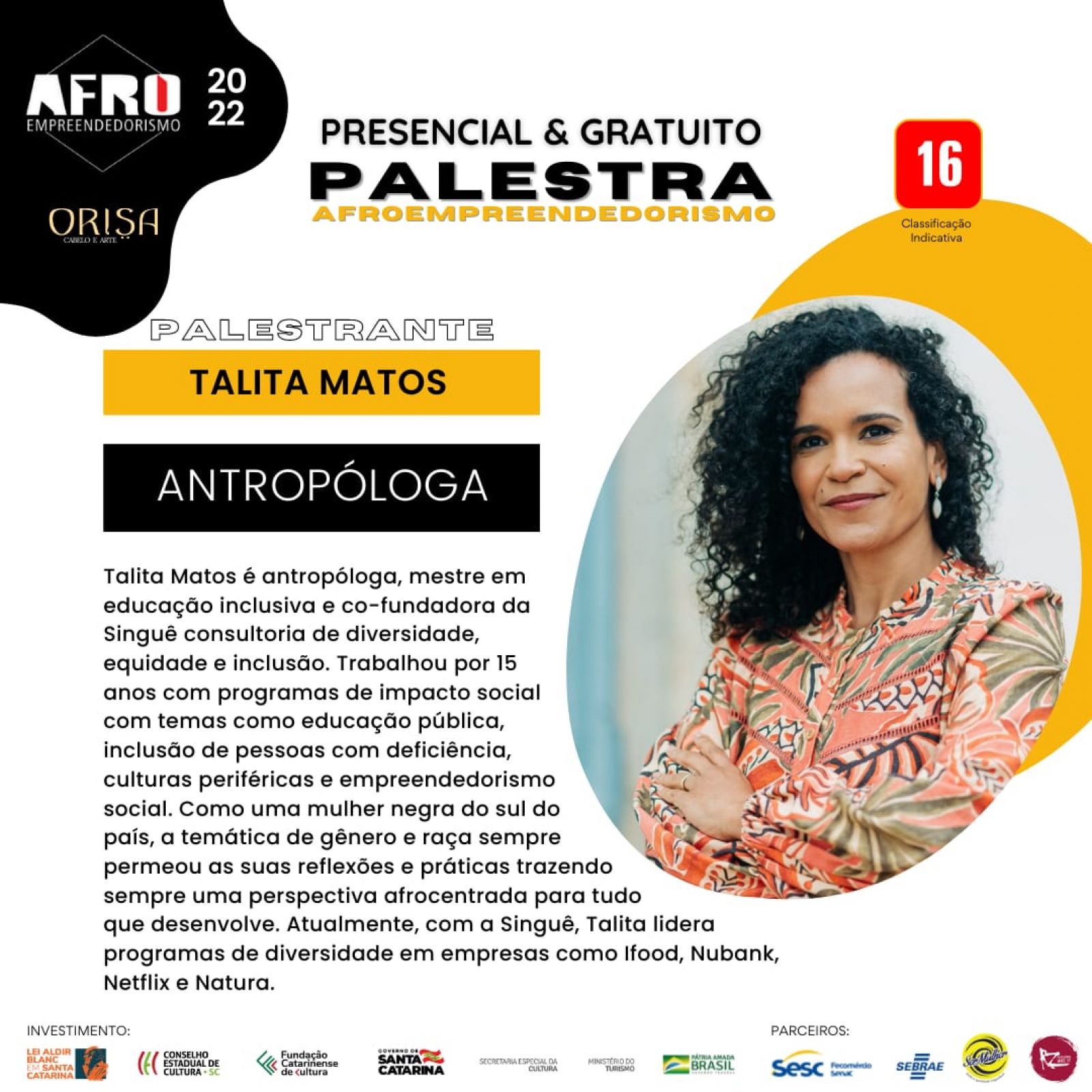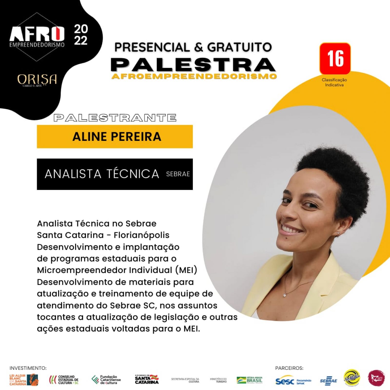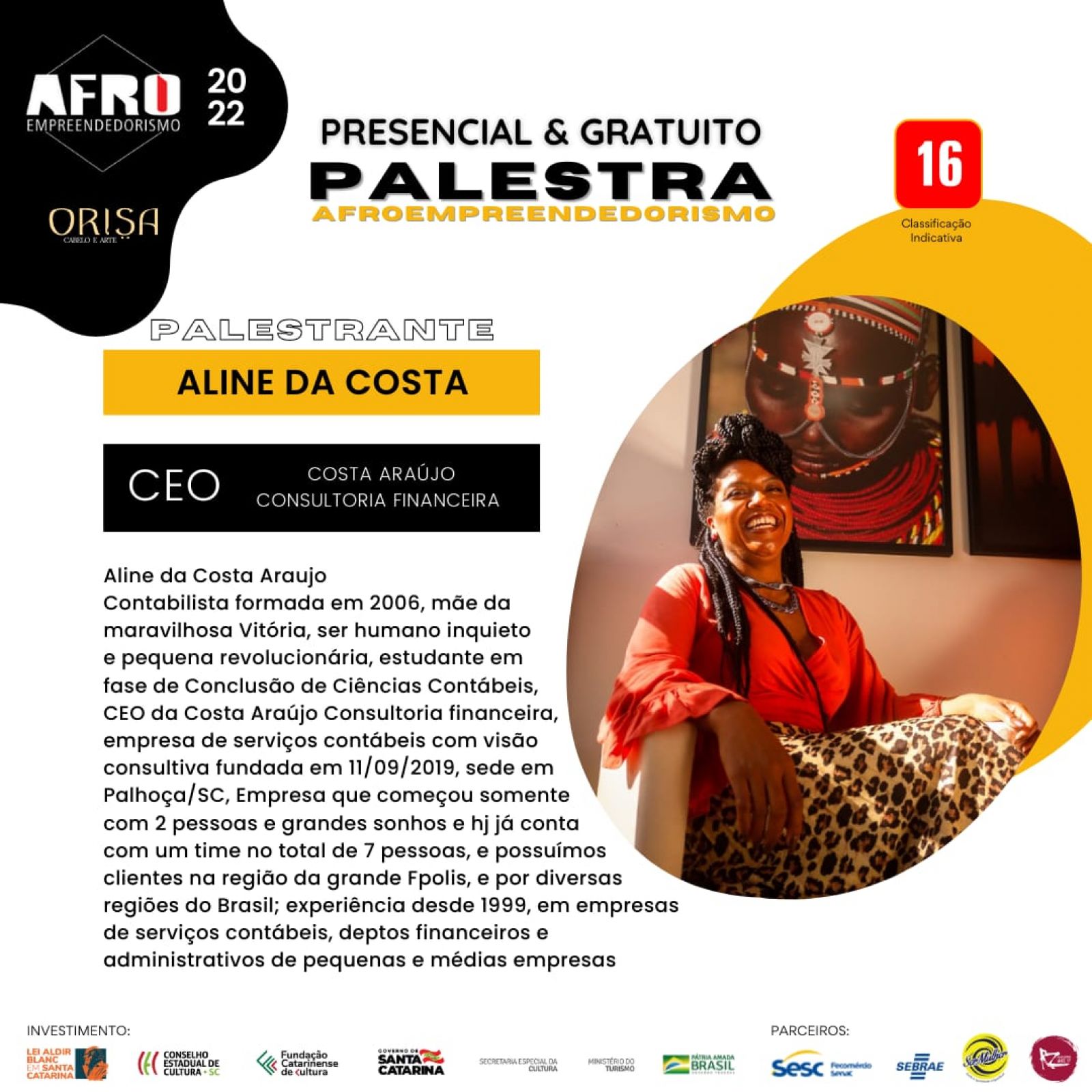 Nesta sexta-feira, dia 27 de maio, será lançado no Teatro do Sesc Prainha, em Florianópolis, o Projeto Estética Afro – Afro Empreendedorismo, com programação durante o final de semana. Na ocasião, haverá palestras da consultora financeira Aline da Costa Araújo, da analista técnica do Sebrae Aline Pereira, da administradora Caroline Maier, da antropóloga Talita Matos e da influenciadora Vitorí da Silva.