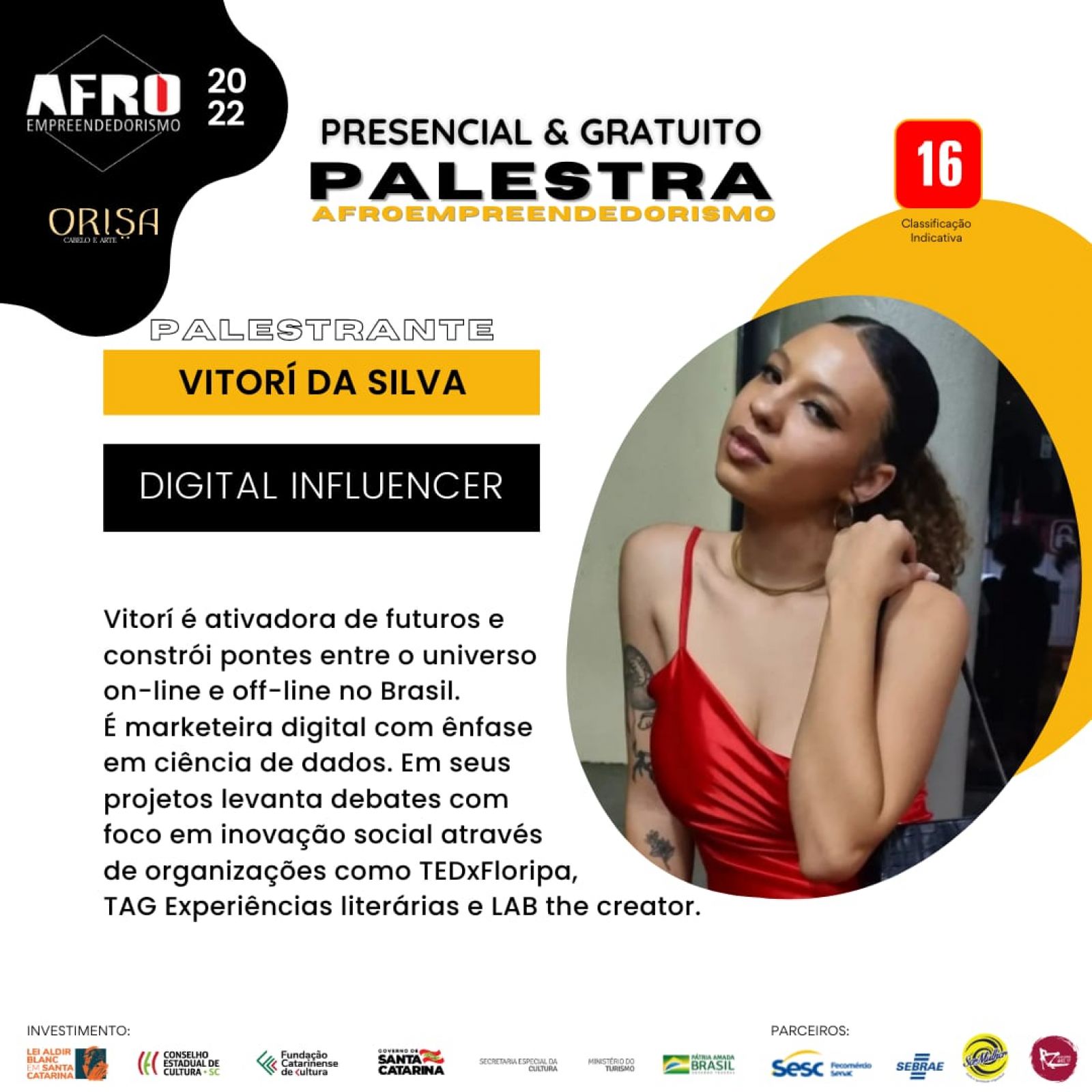 O evento é dirigido a meninas e mulheres negras interessadas no empreendedorismo e na qualificação em estética afros para atuarem no mercado de trabalho. As inscrições são gratuitas pelo Instagram @orisacabeloearte.
