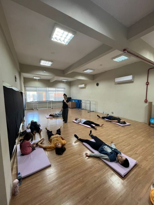 Marcela Ribeira ministra a Oficina "Laboratório dos Sentidos". Renomada pela sua abordagem em dança contemporânea e consciência corporal, ela conduziu os participantes por um caminho de exploração lúdica do próprio corpo. A oficina, baseada em práticas somáticas do Body-Mind Centering℠ e na Técnica Klauss Vianna, promoveu estados de presença através do movimento.
