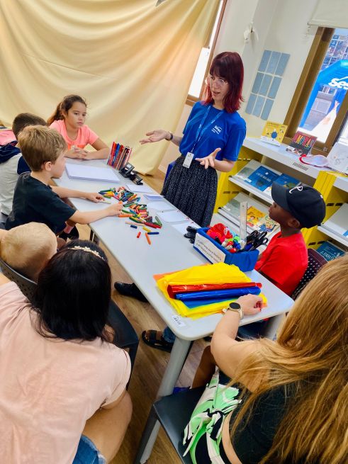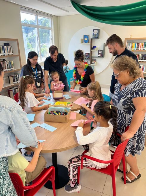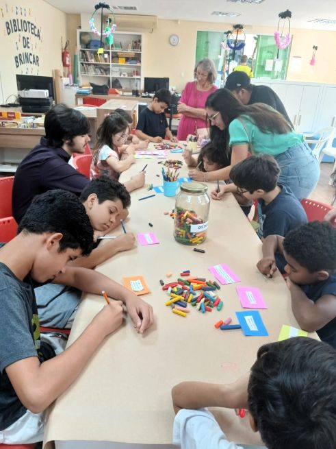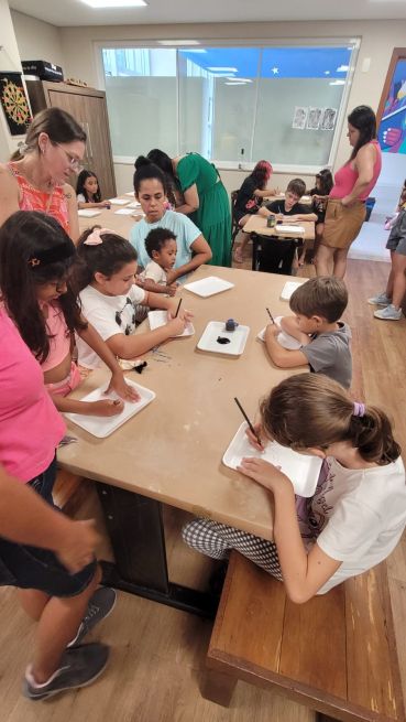 Em seguida, Laís conduziu uma oficina de escrita criativa, onde crianças e responsáveis se reuniram em torno de um grande papel craft no chão, desenhando e escrevendo palavras que rimavam. A atividade culminou na criação de um poema coletivo, feito a partir das palavras e rimas propostas pelos participantes, o que proporcionou uma experiência única de interação com a literatura.