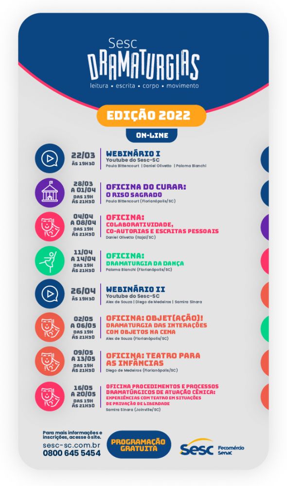 A programação traz ainda dois webnários conduzidos pelos ministrantes das oficinas, com transmissão pelo YouTube Sesc-SC. O Webnário I na abertura do projeto no dia 22.03, às 19h30, contará com a participação de Paula Bittencourt (Dramaturgia do Circo), Daniel Olivetto (Dramaturgia da Atuação) e Paloma Bianchi (Dramaturgia da Dança). O Webnário II, no dia 26.04, às 19h30, será conduzido por Alex de Souza (Dramaturgia da Encenação), Diego de Medeiros (Dramaturgia da Encenação) e Samira Sinara (Dramaturgia da Atuação).