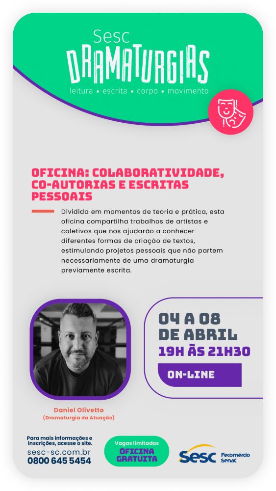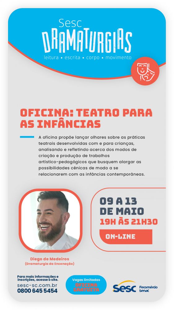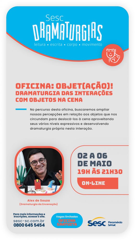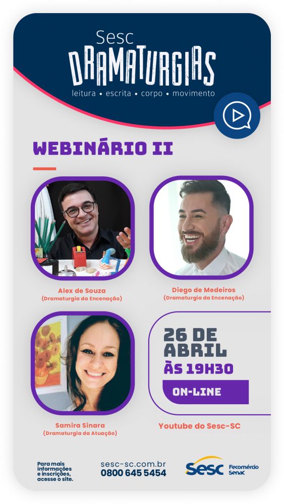 Referência nacional quando o assunto é ação formativa em artes cênicas, experimentação, pesquisa e intercâmbio artístico, o “Sesc Dramaturgias” promove uma ampla programação on-line em Santa Catarina. Com uma trajetória de 24 anos, o projeto reafirma o nosso compromisso institucional com a formação de artistas, articulando fruição, teorias, processos, ferramentas e métodos, através do circo, da dança e do teatro.