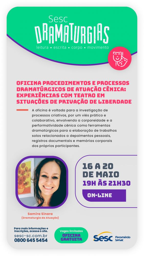 Oficina: Procedimentos e processos dramatúrgicos de atuação cênica: Experiências com teatro em situações de privação de liberdade com Samira Sinara (Joinville/SC)