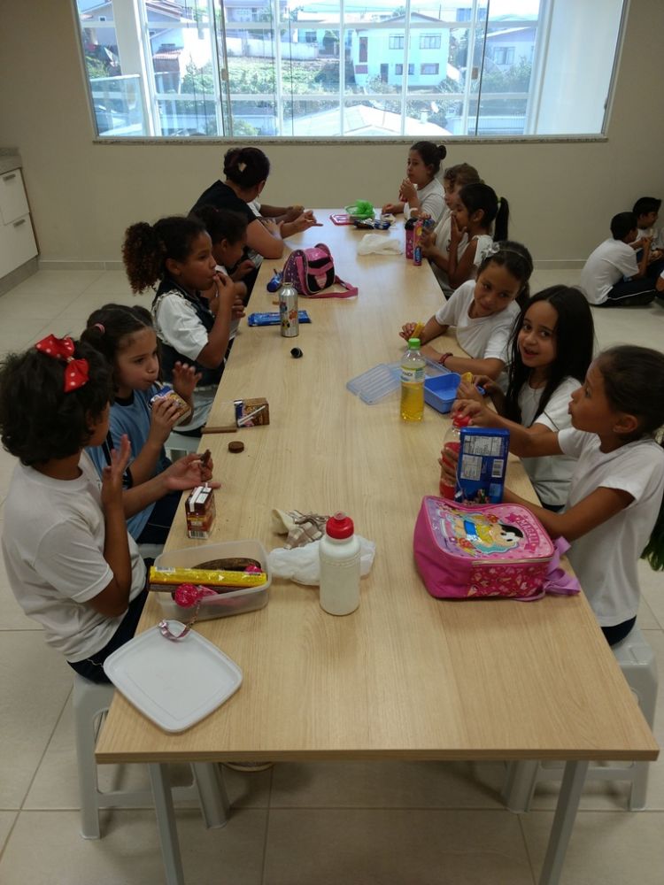 No intervalo das atividades elas fazem seu lanche e assistem um curta