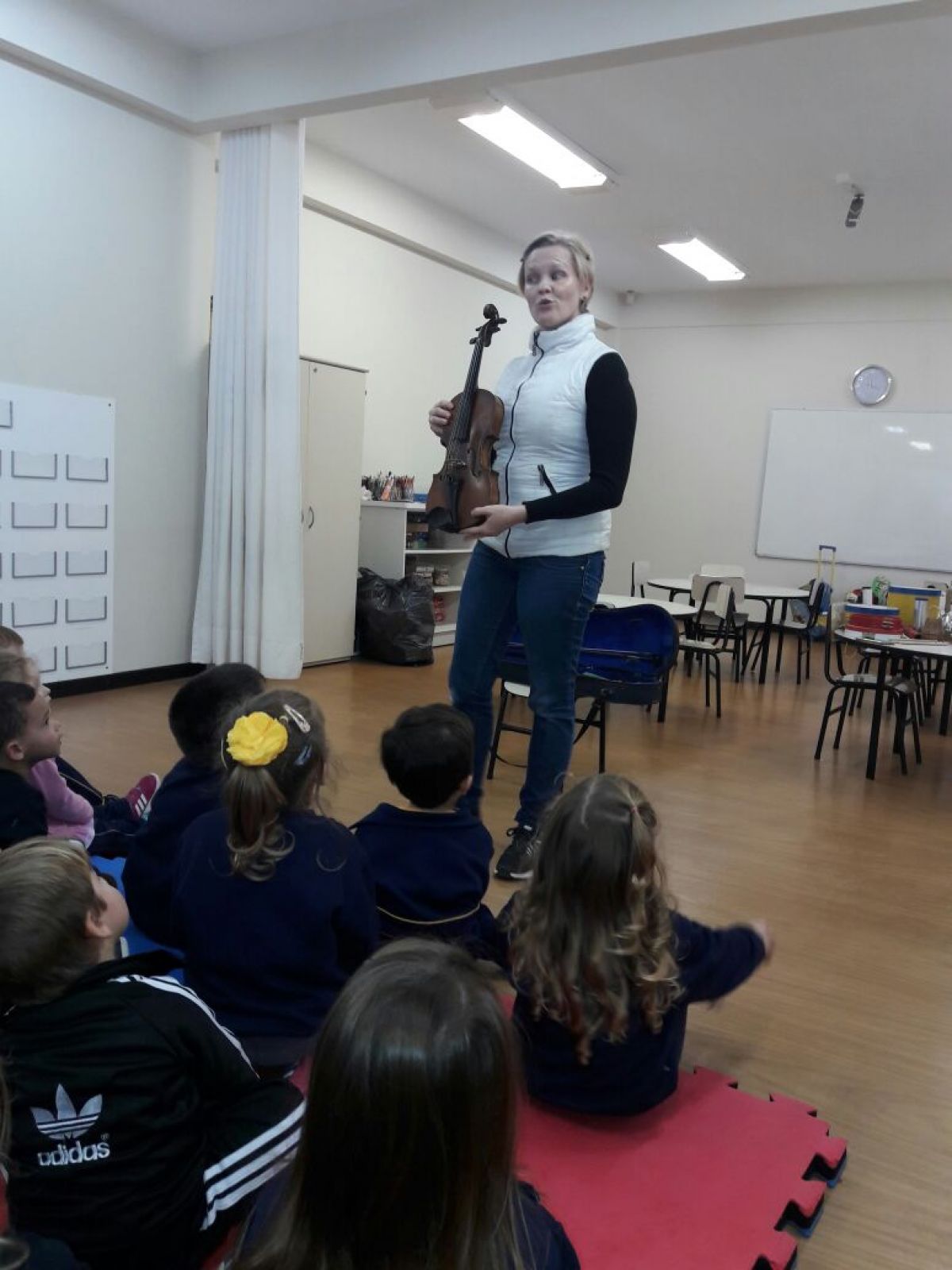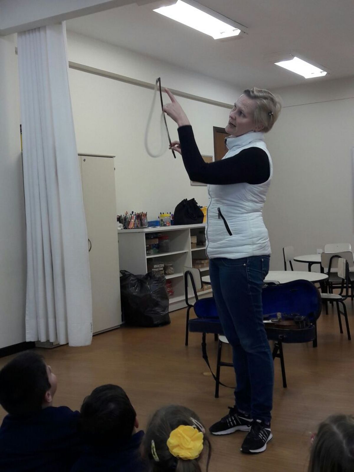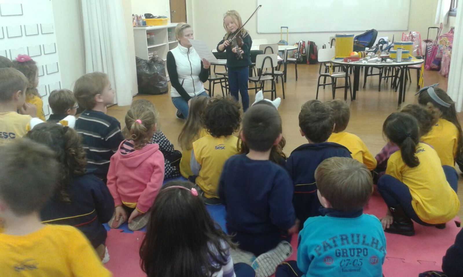 Nessa perspectiva a turma de 2 e 3 anos da professora Patrícia, do Sesc em São Bento do Sul, desenvolve um projeto sobre “histórias cantadas”. Uma das atividades desenvolvidas foi a visita da professora, violinista, Lidiane Tascheck, que conversou e deslumbrou o universo musical. Lidiane explorou com os alunos uma linda história envolvendo o personagem da “mosca”, nessa história cantada mostrou o violino, seus sons e mostrou a estrutura do instrumento musical.