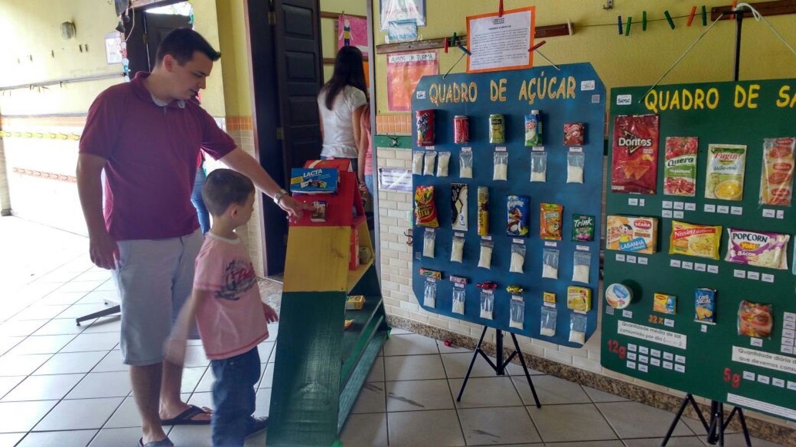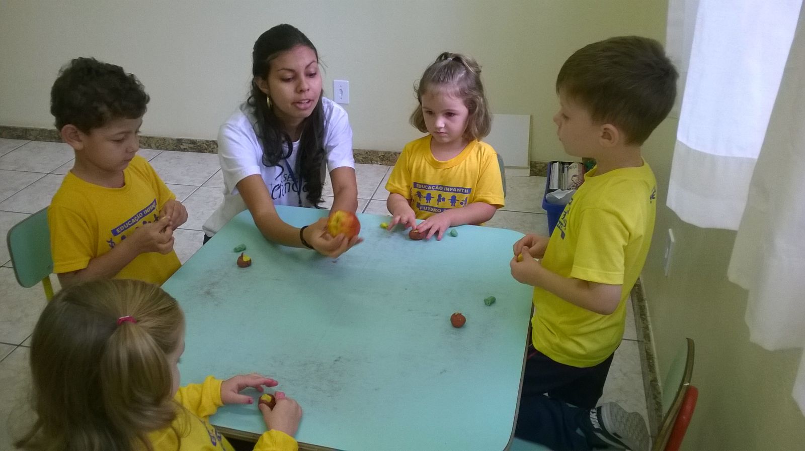 Feito isto, os monitores da Sala de Ciências conversaram com elas sobre a importância da ingestão de frutas para uma boa alimentação e qual o lugar destas na pirâmide alimentar. Assim, elas realizaram a modelagem das frutas mais consumidas no nosso cardápio e que, coincidentemente, são as frutas de suas preferências, utilizando massinha de modelar. A culminância deste trabalho deu-se na I Mostra de Artes e Ideias de 2017.As embalagens dos produtos consumidos pelas crianças e por suas famílias em casa foram devidamente alocados na pirâmide alimentar, juntamente com o quadro de açúcar, de sal e de óleo da Sala de Ciências. Os paineis montados foram expostos e observados pelos pais e, consequentemente, serviram de base para sanar as dúvidas surgidas a partir do relato, da demonstração das crianças e do repertório técnico dos monitores da Sala de Ciências.